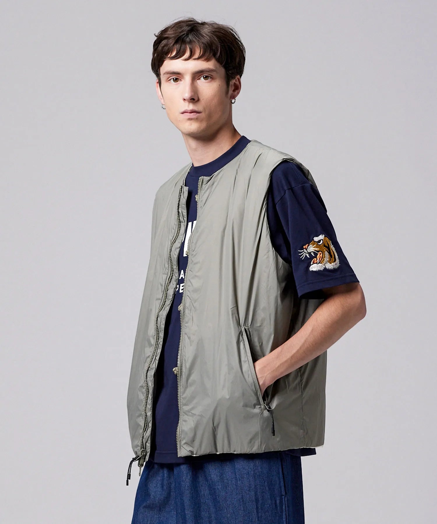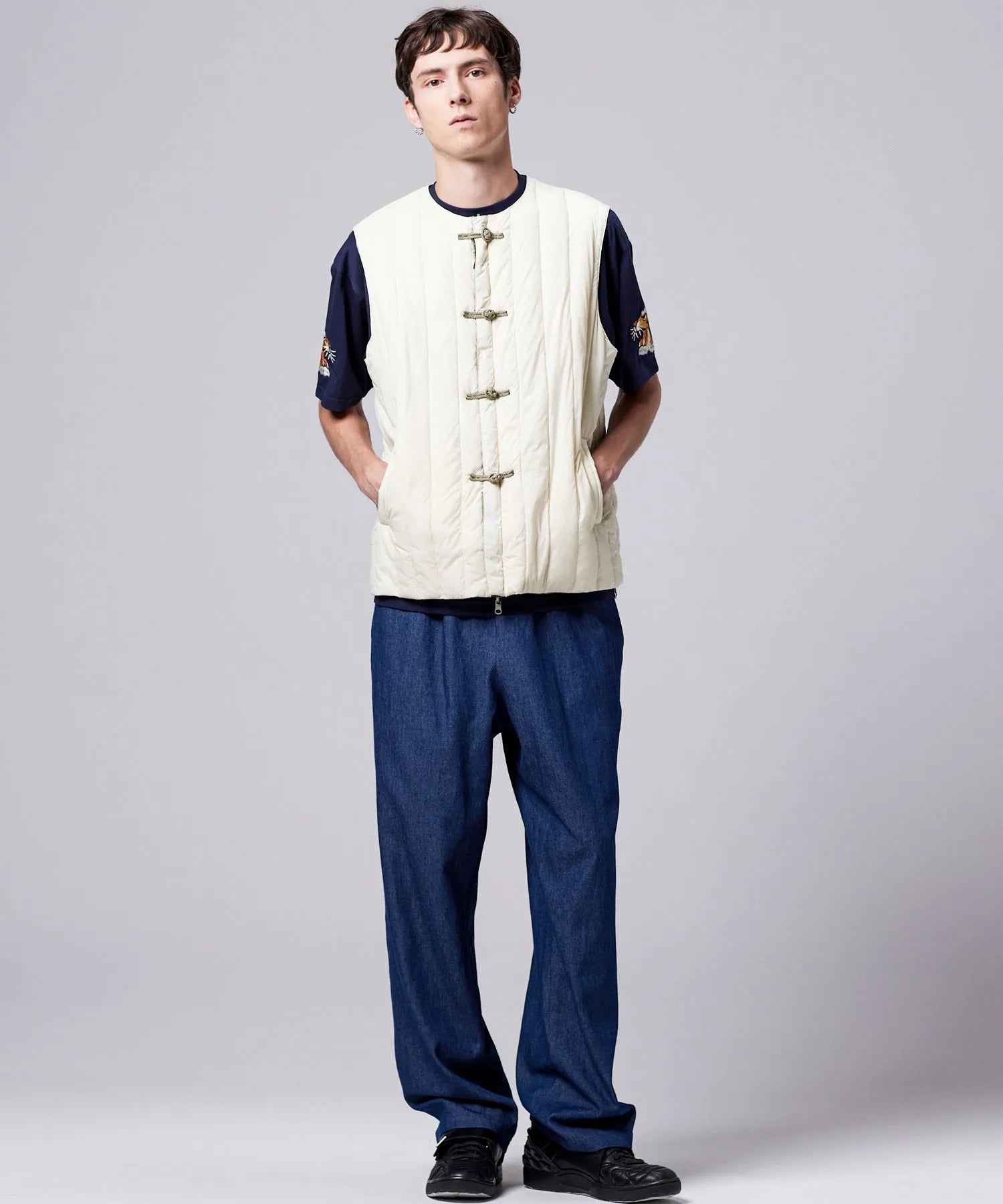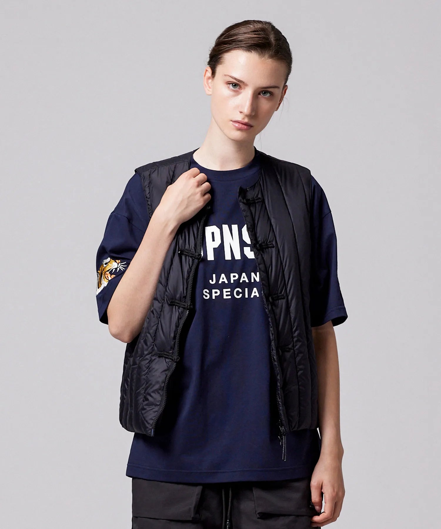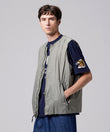 チャイナボタンが映える、リバーシブルダウンベスト。