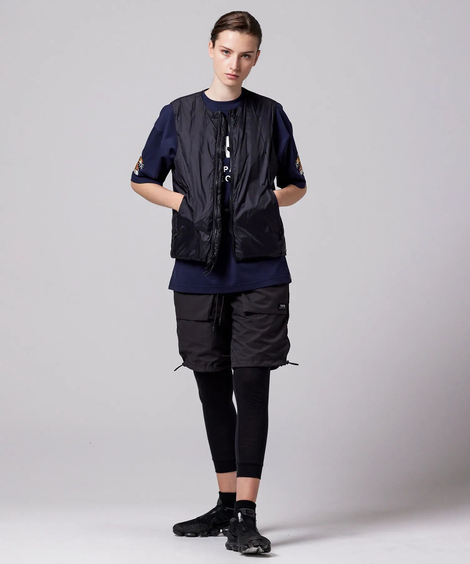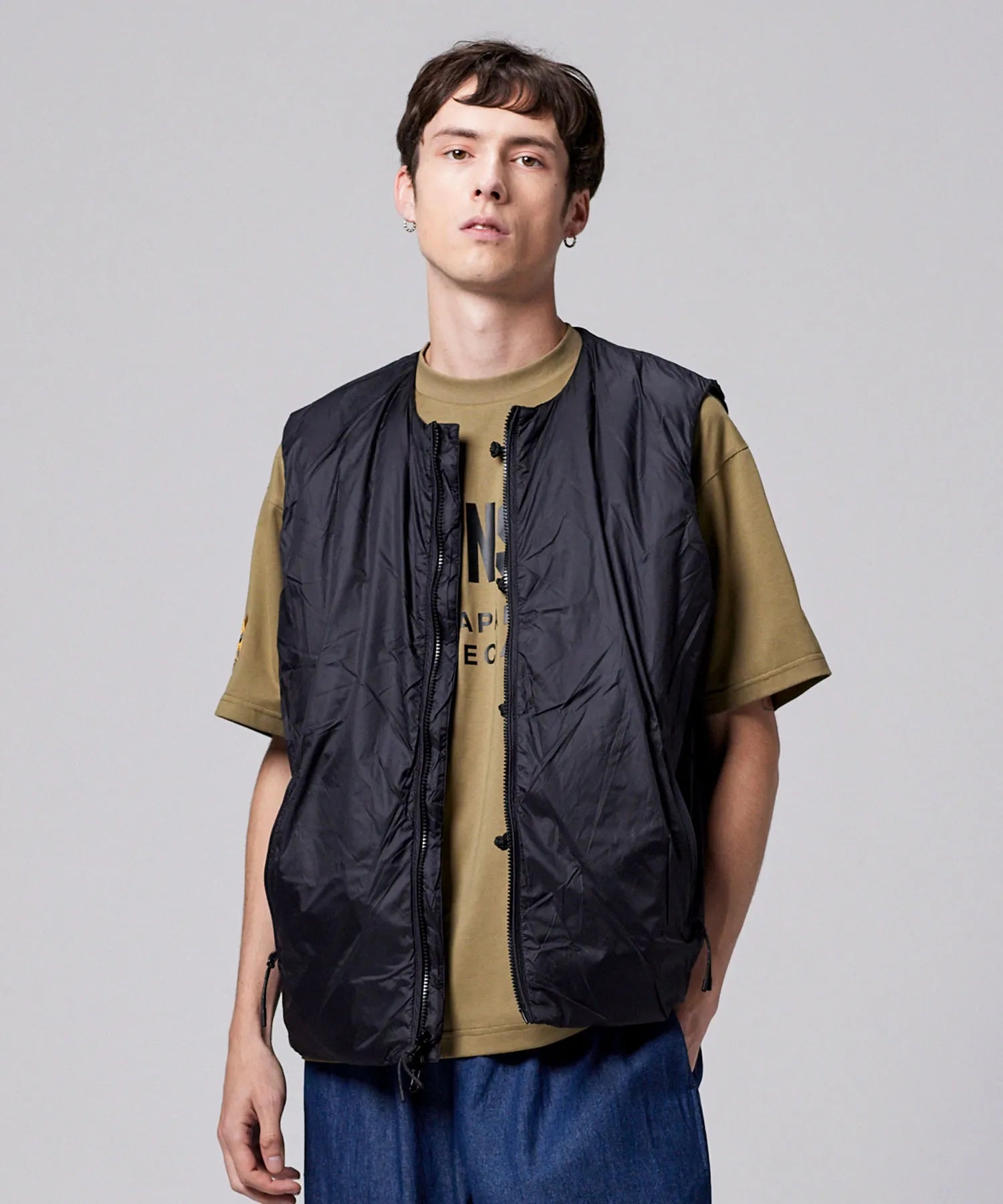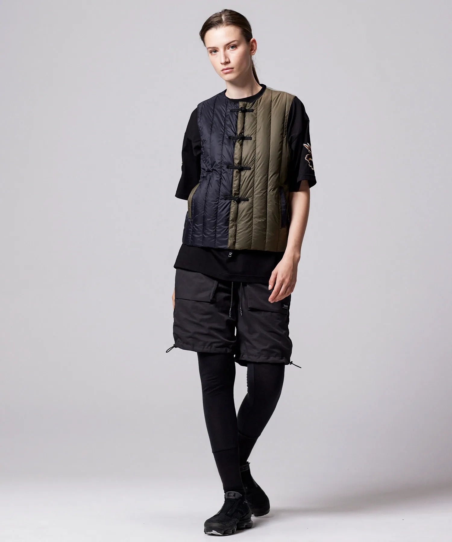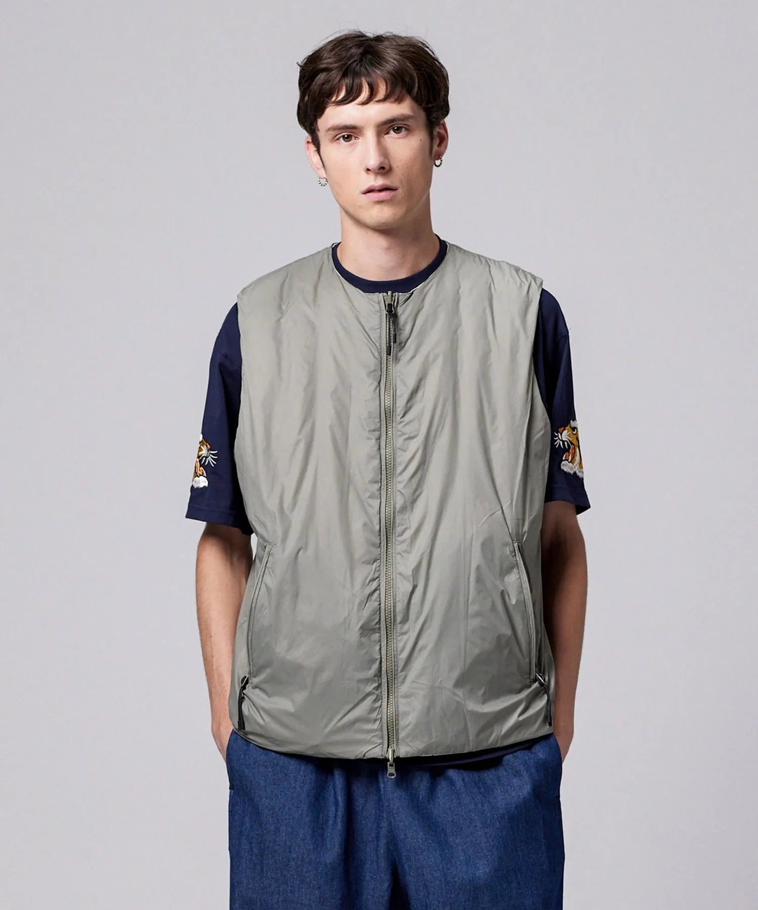 チャイナボタンが映える、リバーシブルダウンベスト。