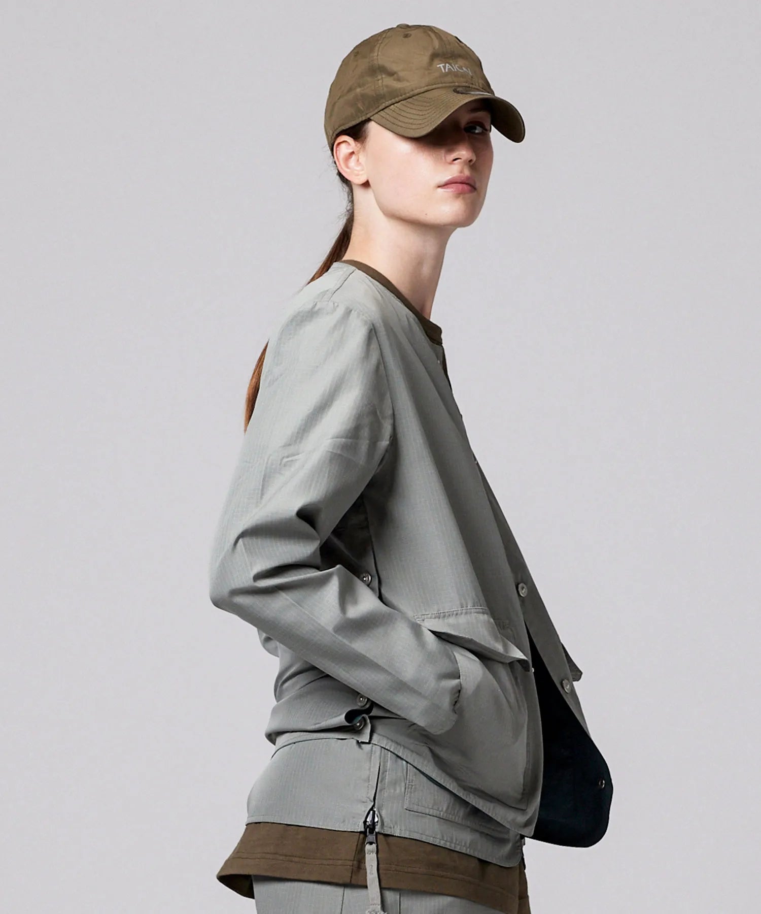 さらに両脇にも金属ボタンスリットを備え、可動域を確保しながらボトムのポケットへもアクセスしやすい設計に。