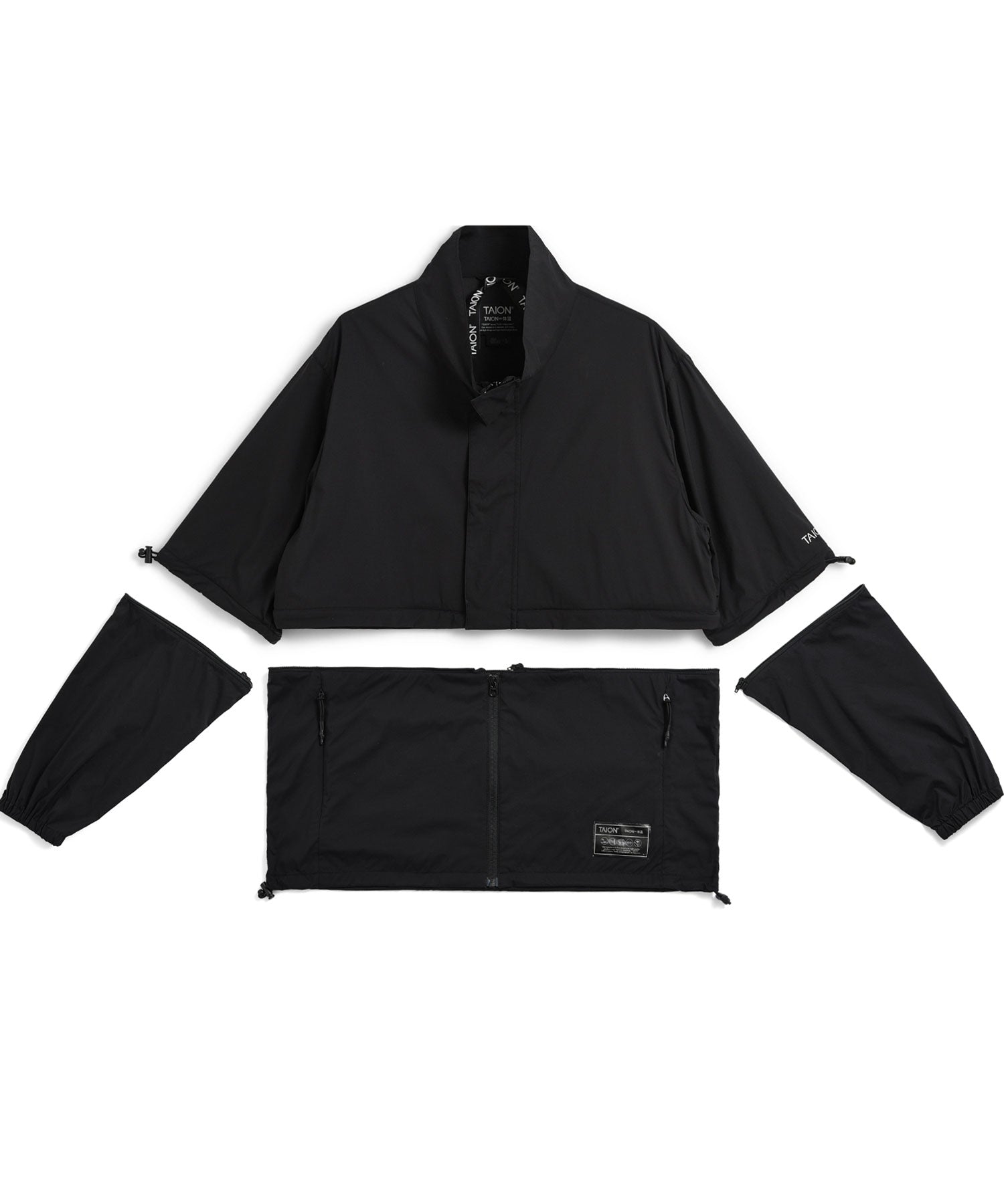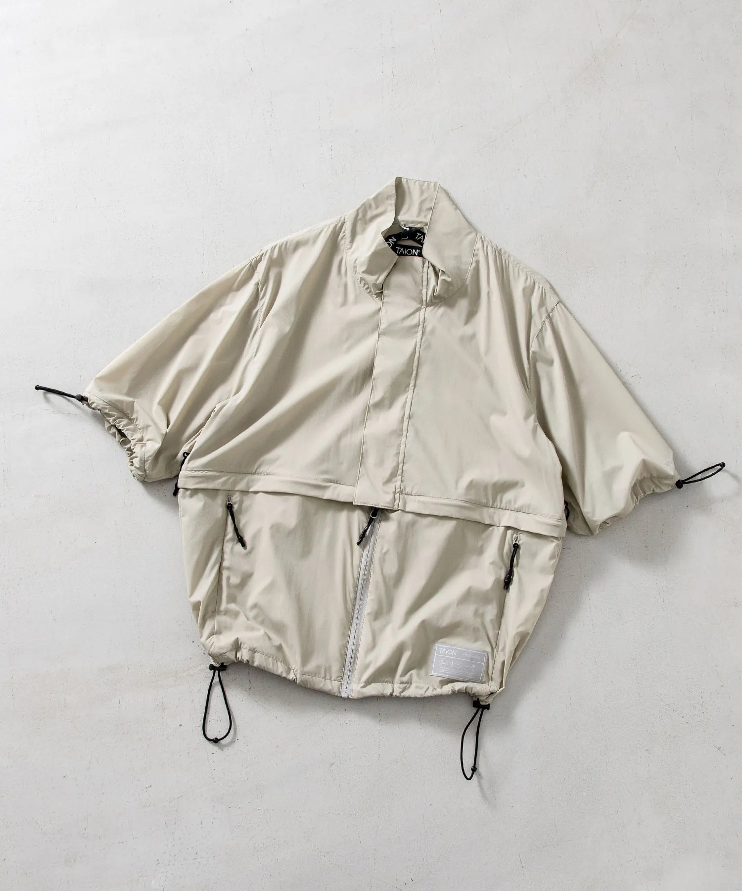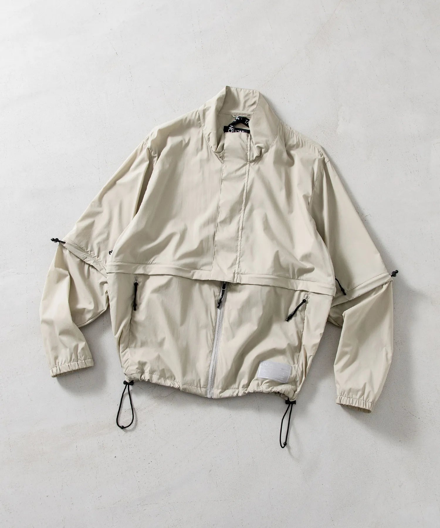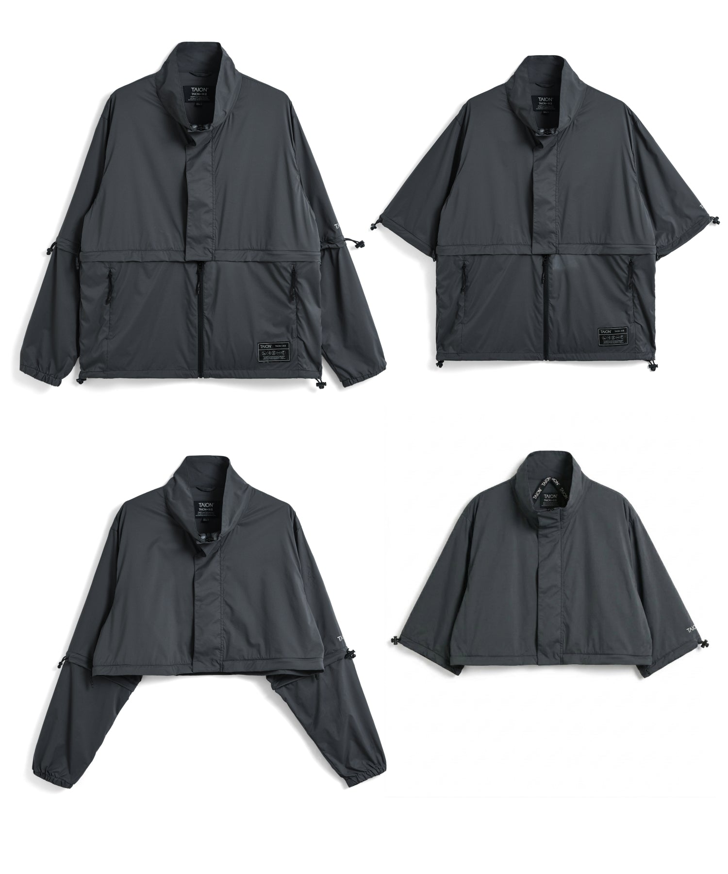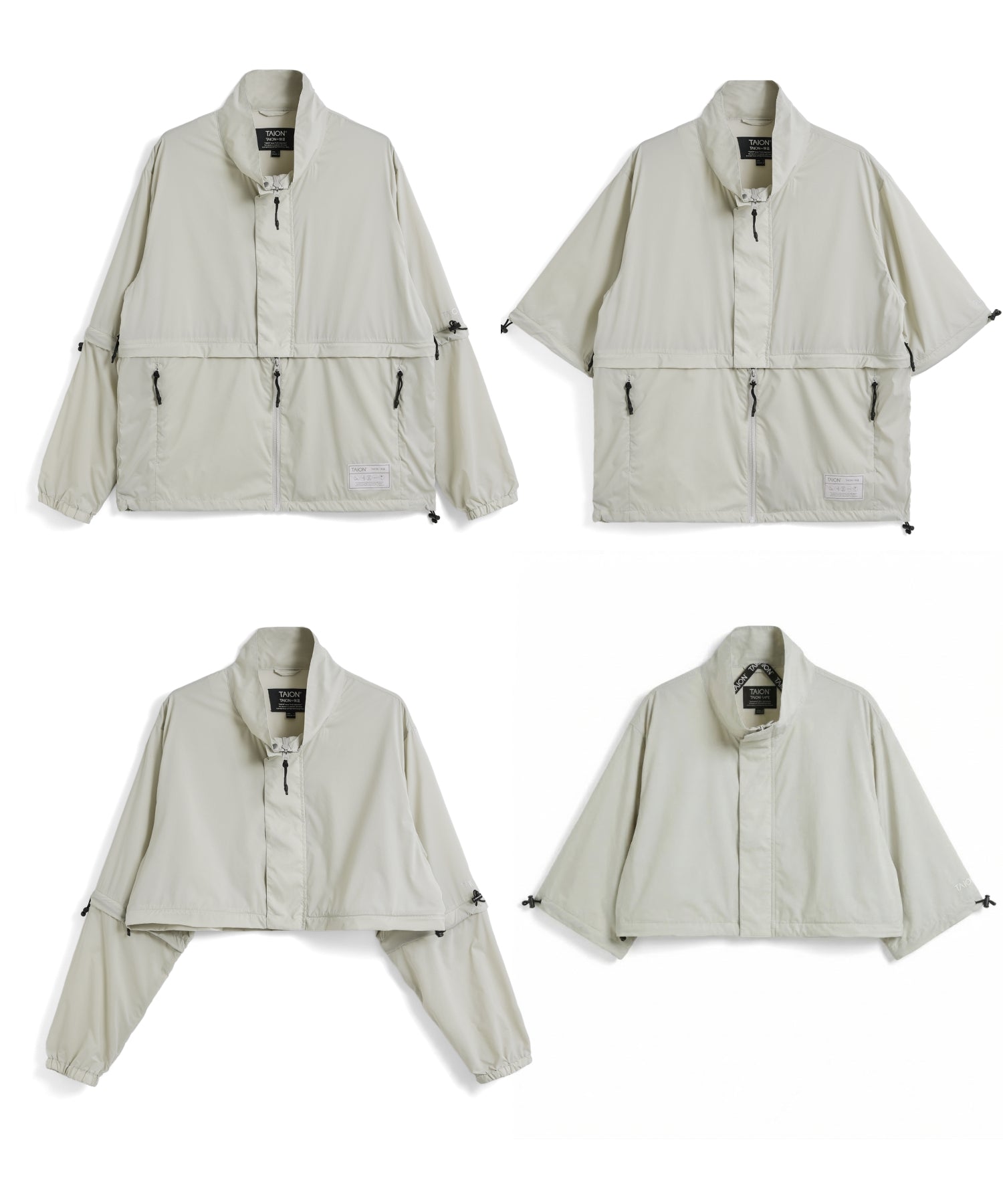 袖や裾はファスナーで取り外し可能な仕様で、気温やシーンに応じた着こなしが楽しめます。(長袖ジャケット・ショート丈ジャケット・半袖ジャケット・半袖ショート丈ジャケットの4通り)