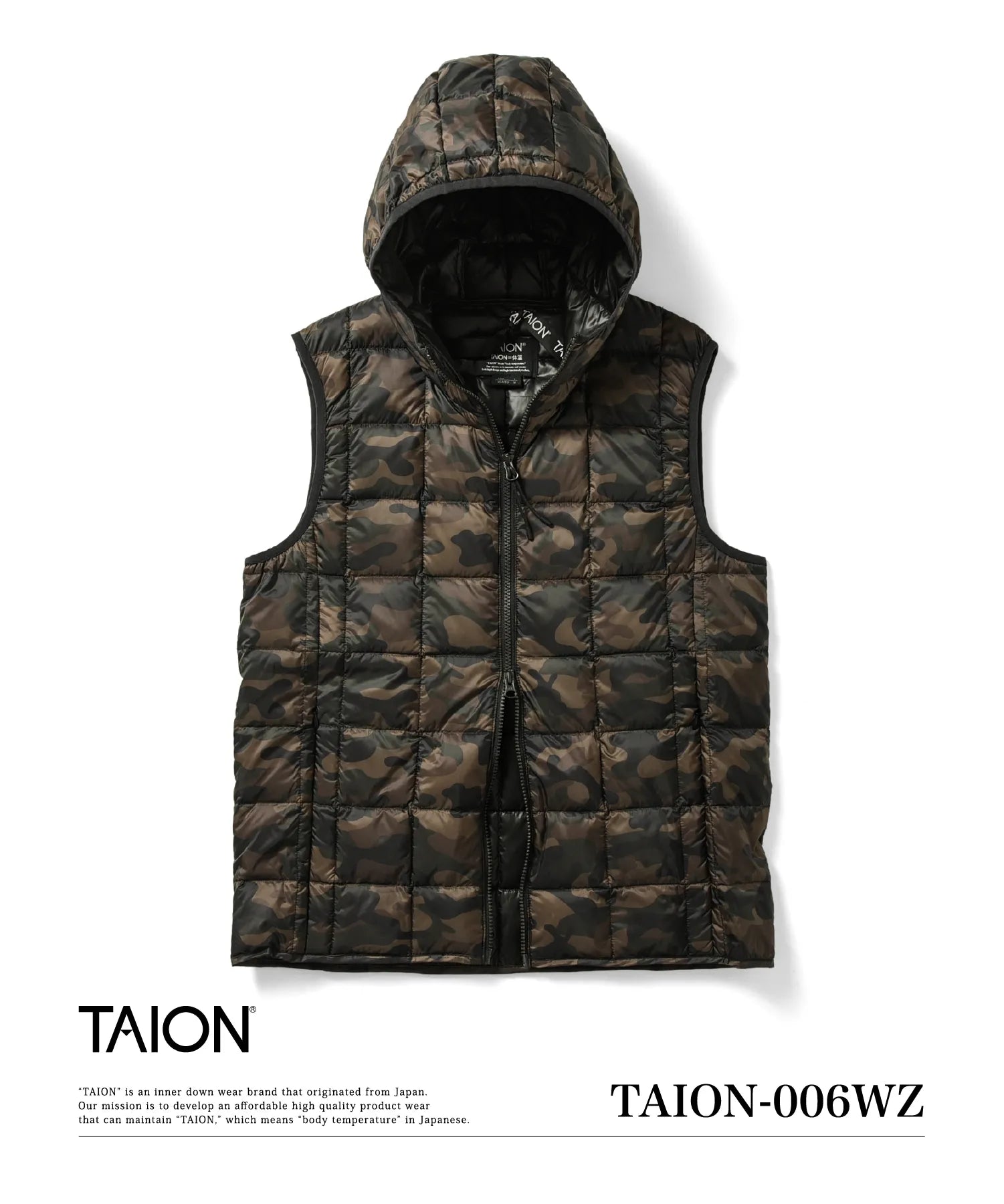 TAIONの定番、ベーシックインナーダウンは、ジャケットやコートの下に着るのはもちろん、Tシャツ・シャツなどの上にも気軽に羽織れる、軽くて暖かく着回しやすいシンプルなデザインが特徴です。