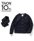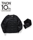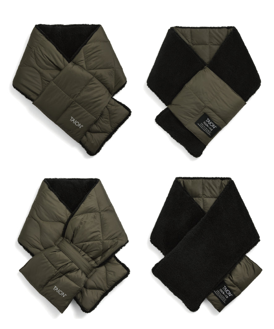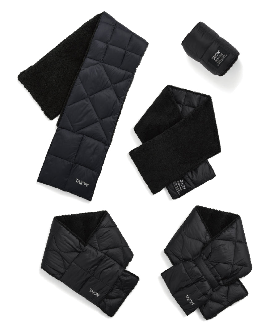 “暖かさ”と“アイデア”を両立させた、 TAION生誕10th限定ダウンマフラーです。表側にはBASIC・CITY・MOUNTAIN・MILITARY、 4つのラインのキルティングをクレイジーに組み合わせ、先端にはさりげなくTAION反射プリントが入ります。 裏側にはボア素材を使用。