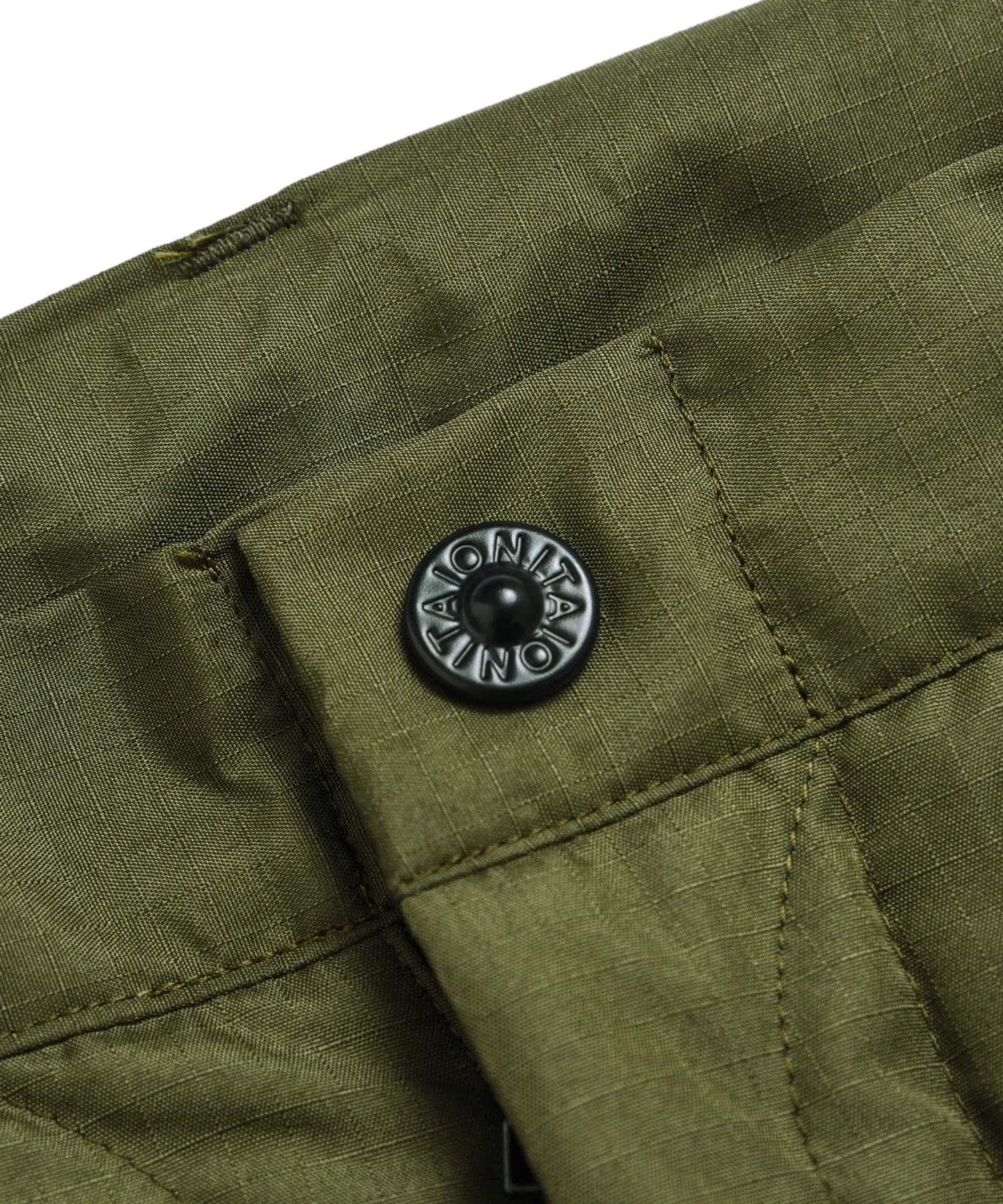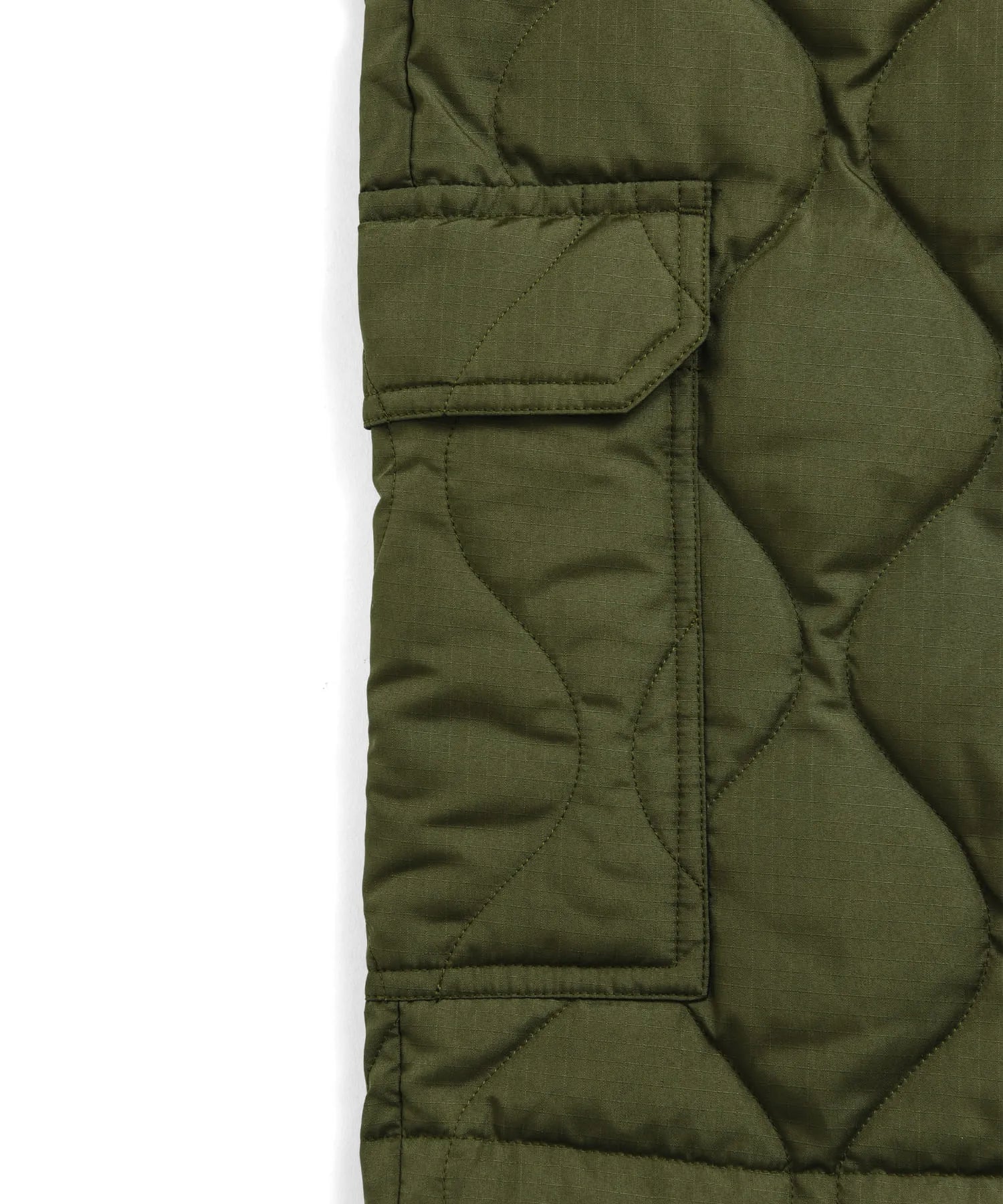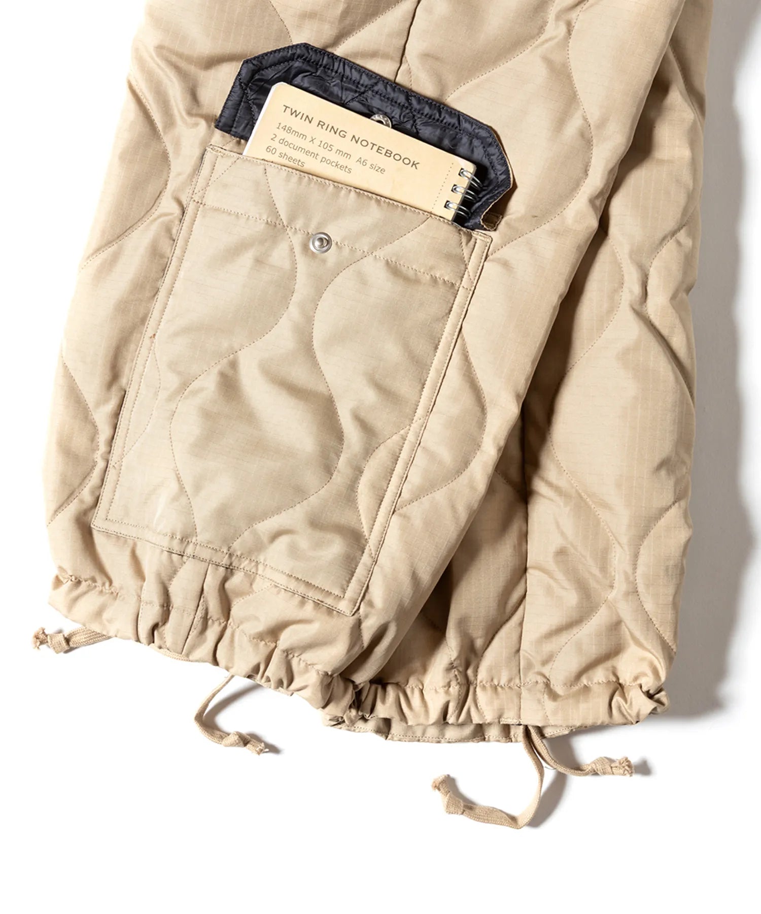 TAIONのミリタリーダウンパンツをベースに、GRIP SWANYならではの多機能ポケットを融合。風を通さず、足元まで暖かい。タウンユースからキャンプ、アウトドアシーンまで幅広く対応します。同シリーズのダウンベストやジャケットとのセットアップもオススメです。