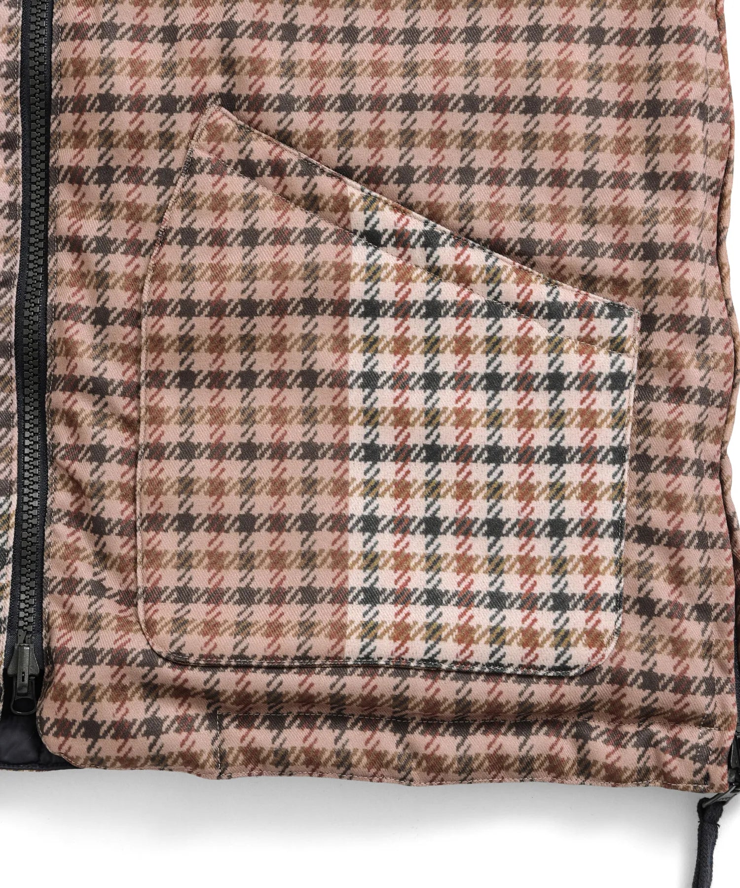 表面はTAIONの定番デザインを踏襲し、裏面にはクラシックなガンクラブチェックプリント、1枚で2つの表情を楽しめるダウンウェアです。