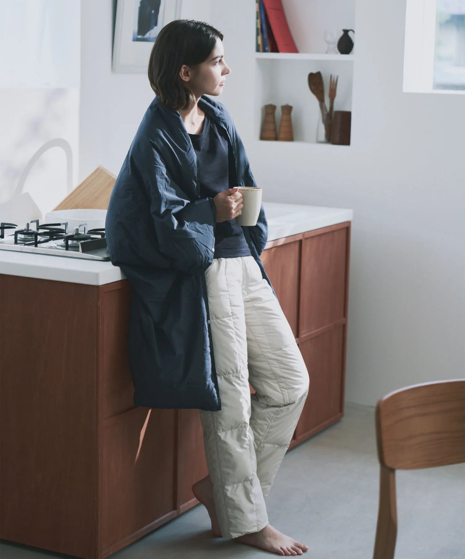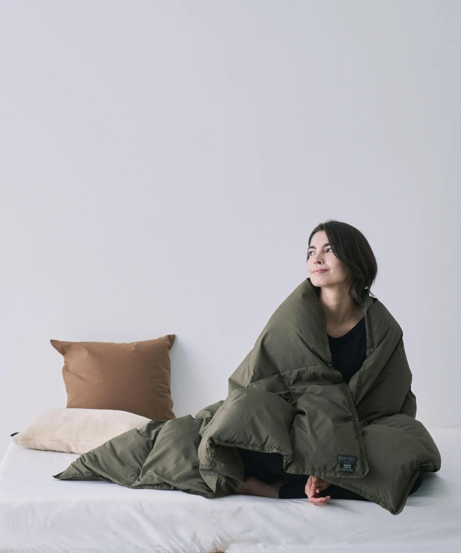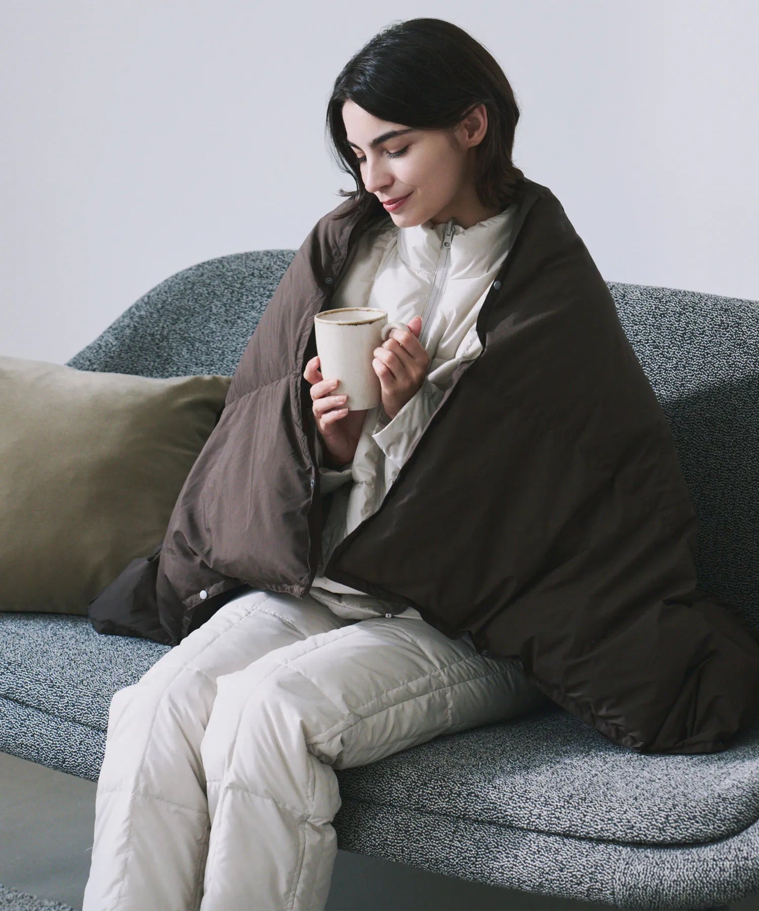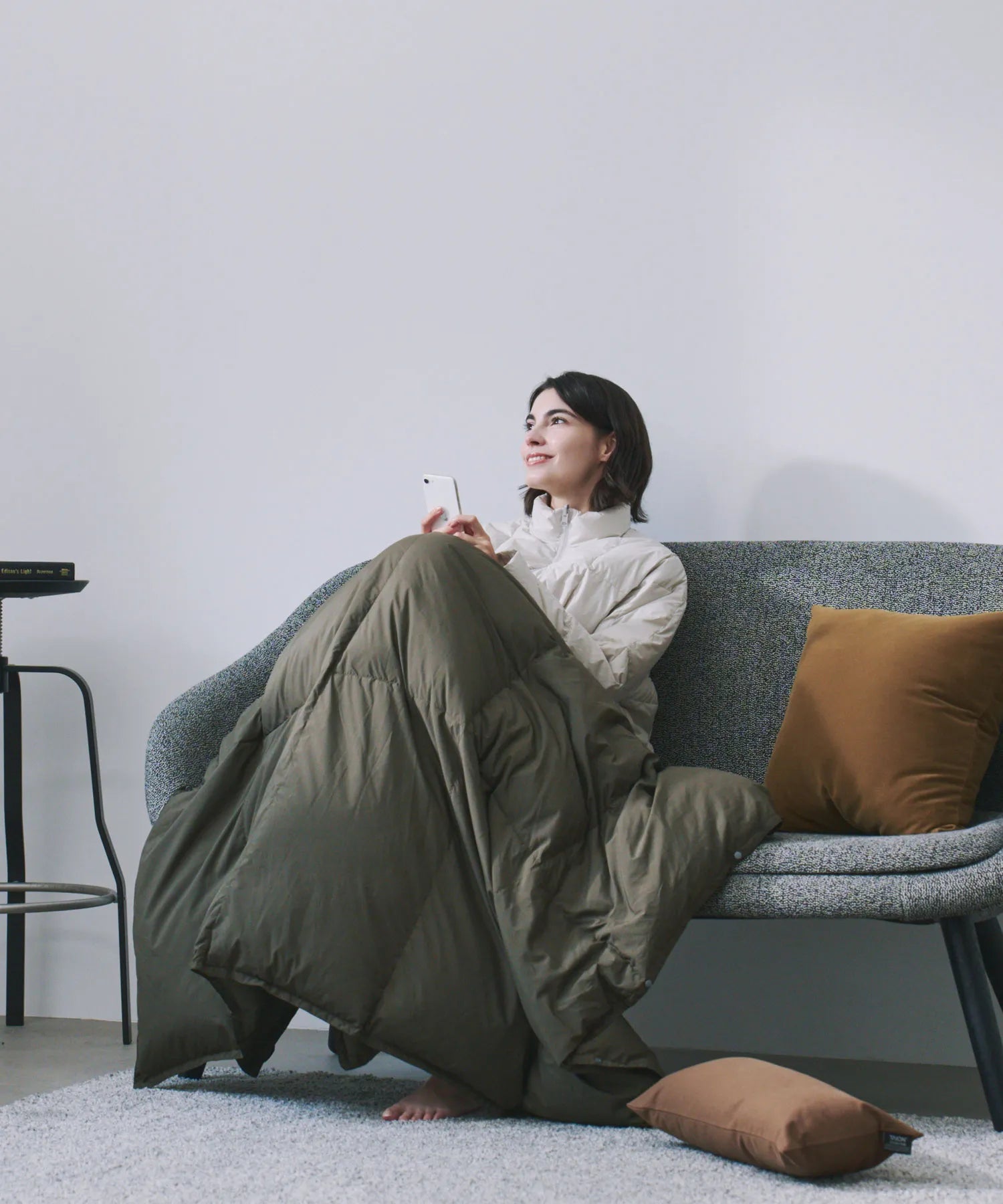腰から足元までをしっかり温められるコンパクトなサイズ(H105cm×W145cm)で、布団よりも小ぶりなサイズ感は、お子さまの掛け布団としても最適。お昼寝や就寝時にも使いやすく家族でシェアできる1枚です。軽くて暖かい800FPの上質なダウンを使用。柔らかい心地良さで、ふんわりと体を包み込みます。