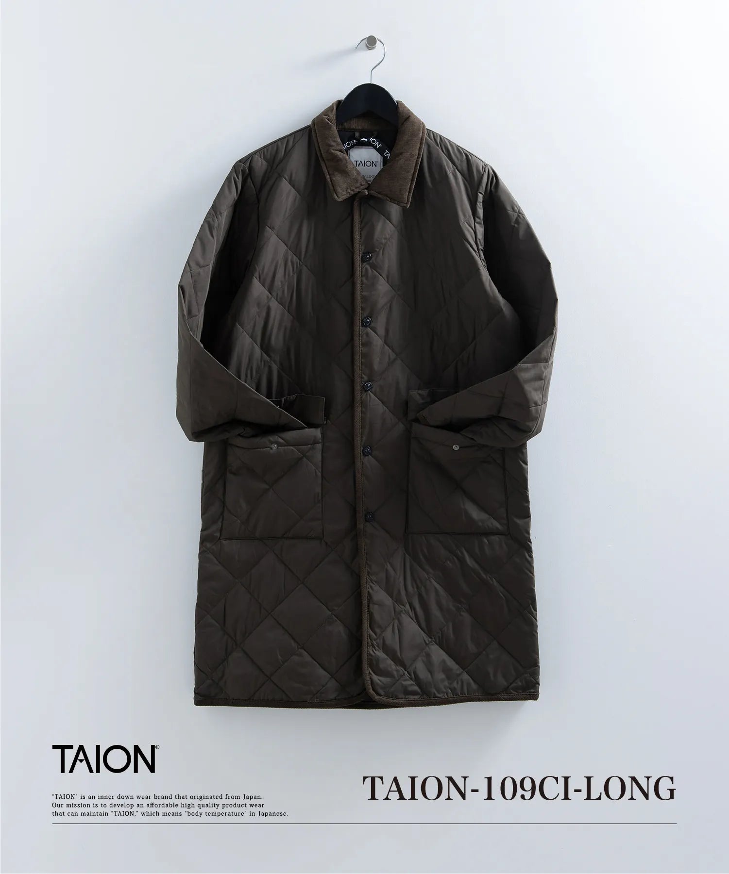 程よいシャリ感のあるポリエステル素材を採用、保温性に優れた800FPダウンにダイヤキルト、更にコーデュロイ素材のパイピングを施すことで、カジュアルながらもクラシックな雰囲気に仕上げました。