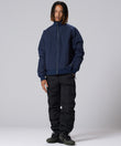 首元まで暖かいハイネック仕様に加え、前たてには上下から開閉できるWジップを採用。