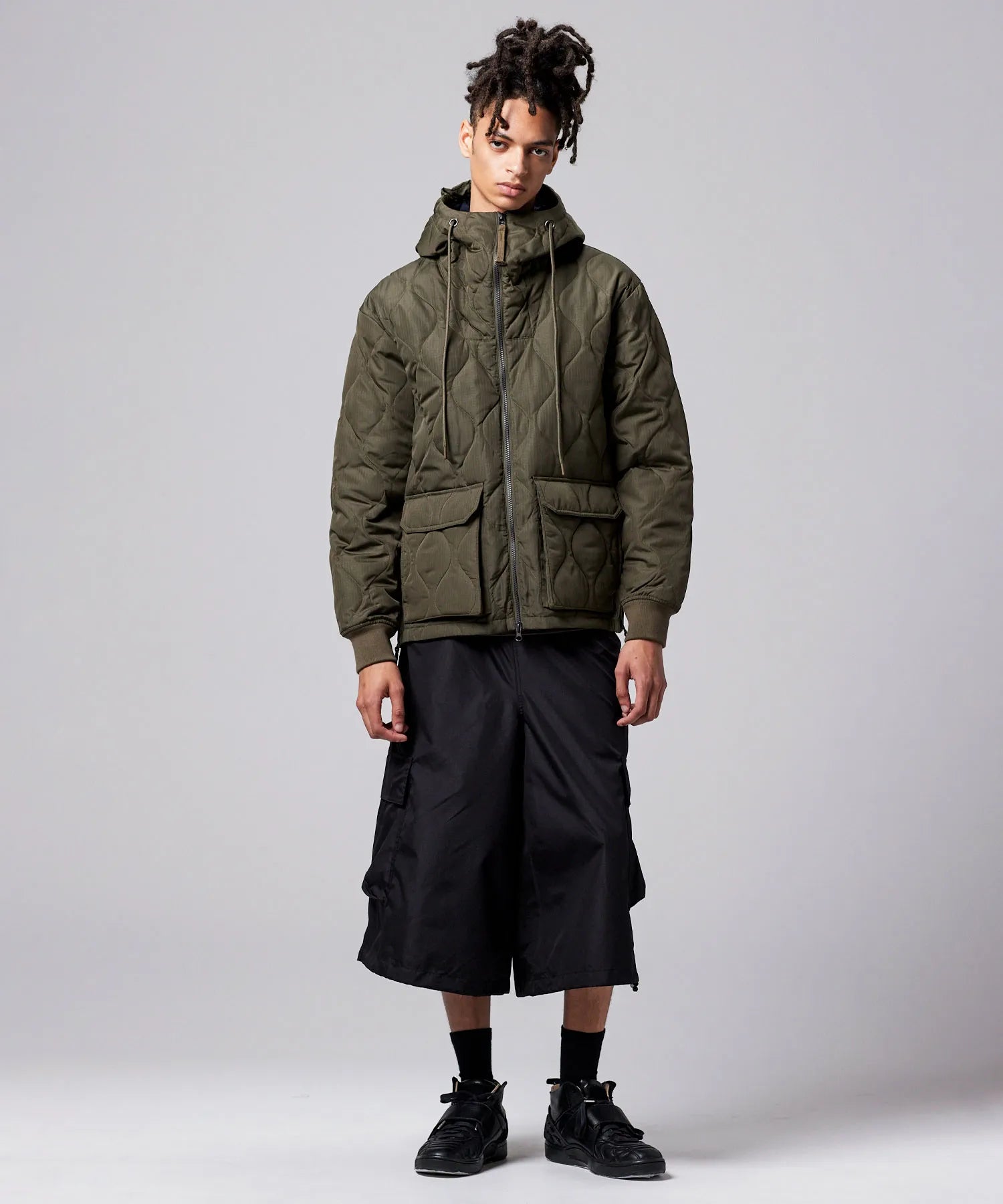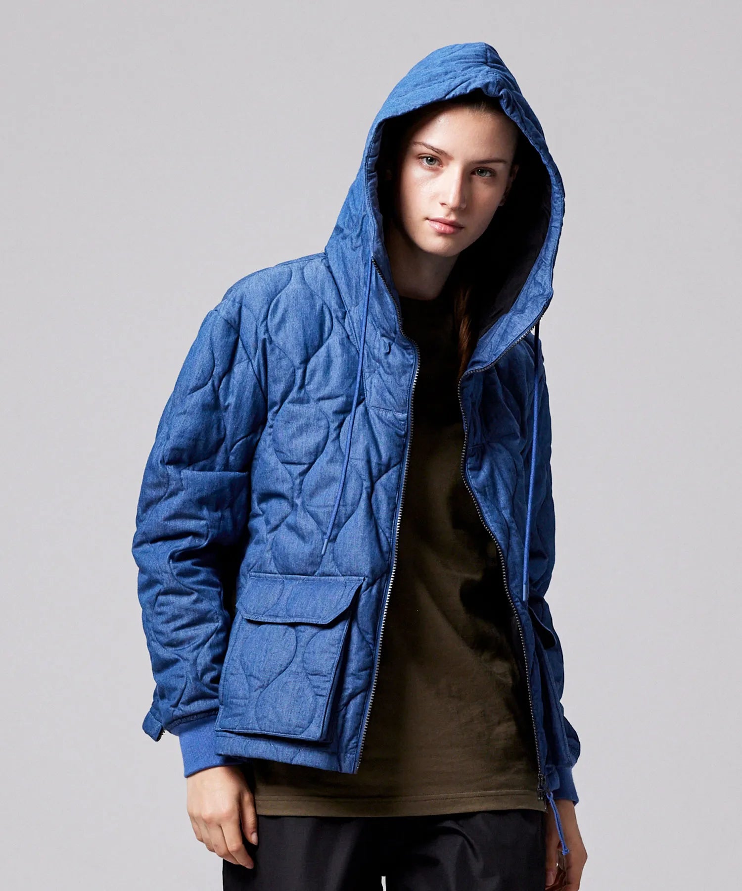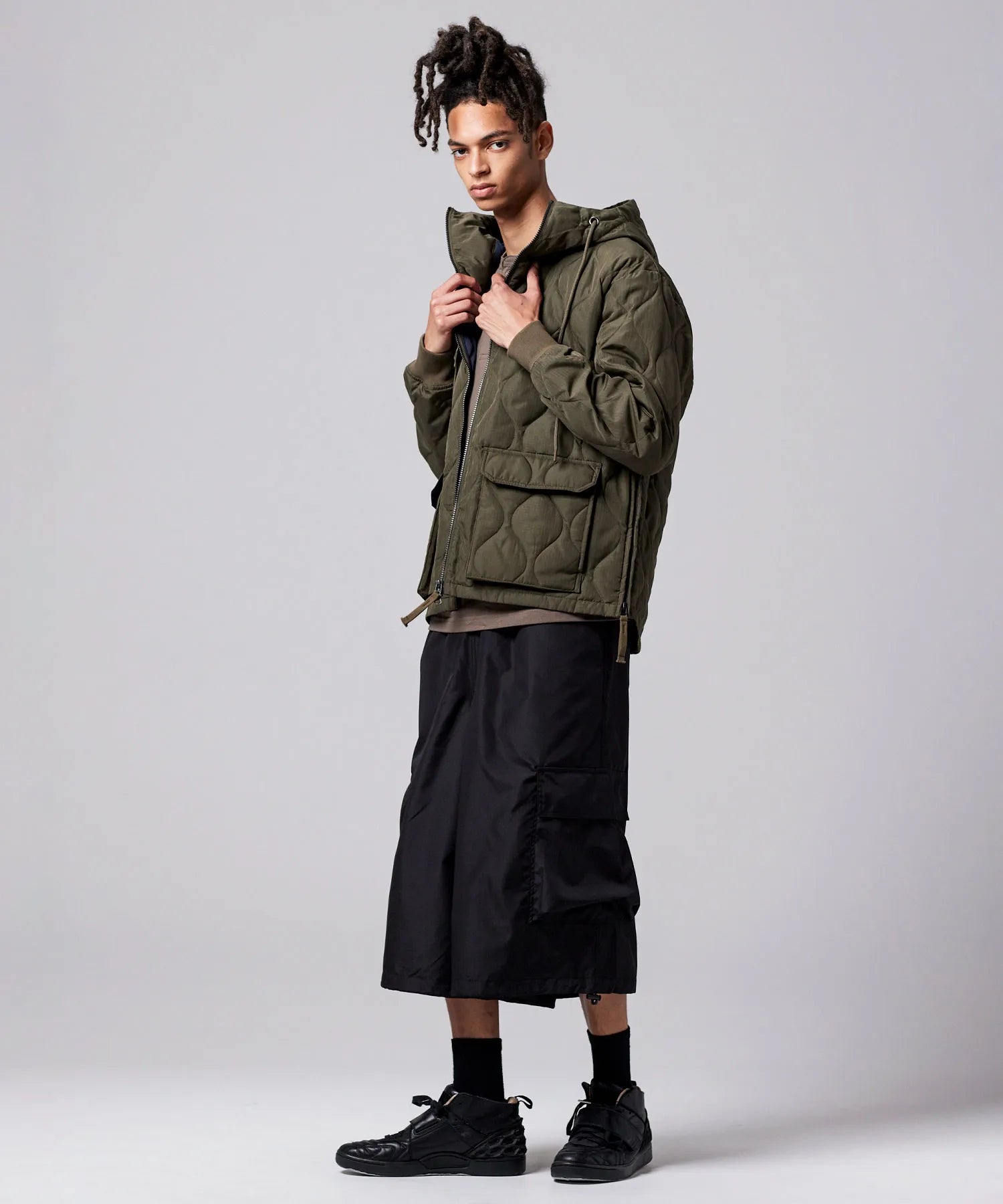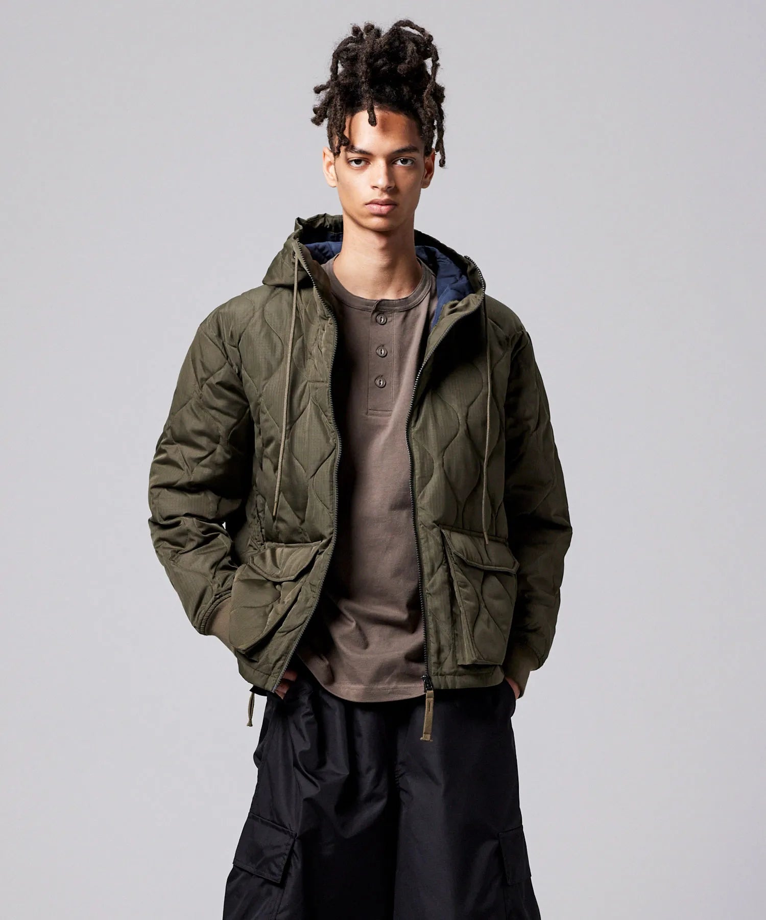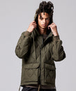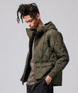 "フードタイプでラフに着れる、Wジップ開閉のミリタリーダウン"