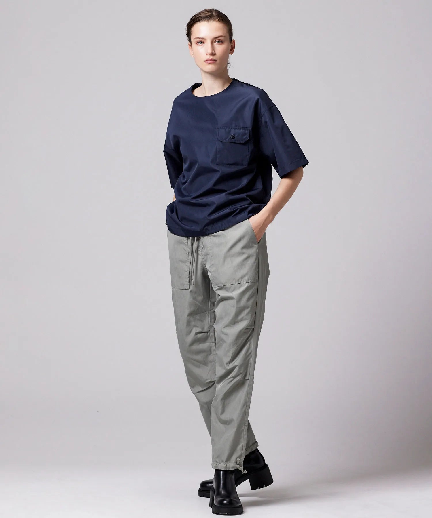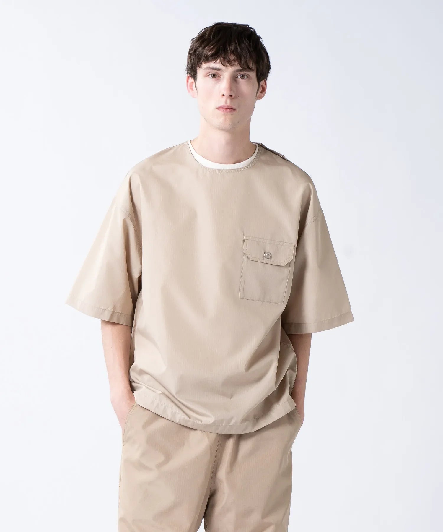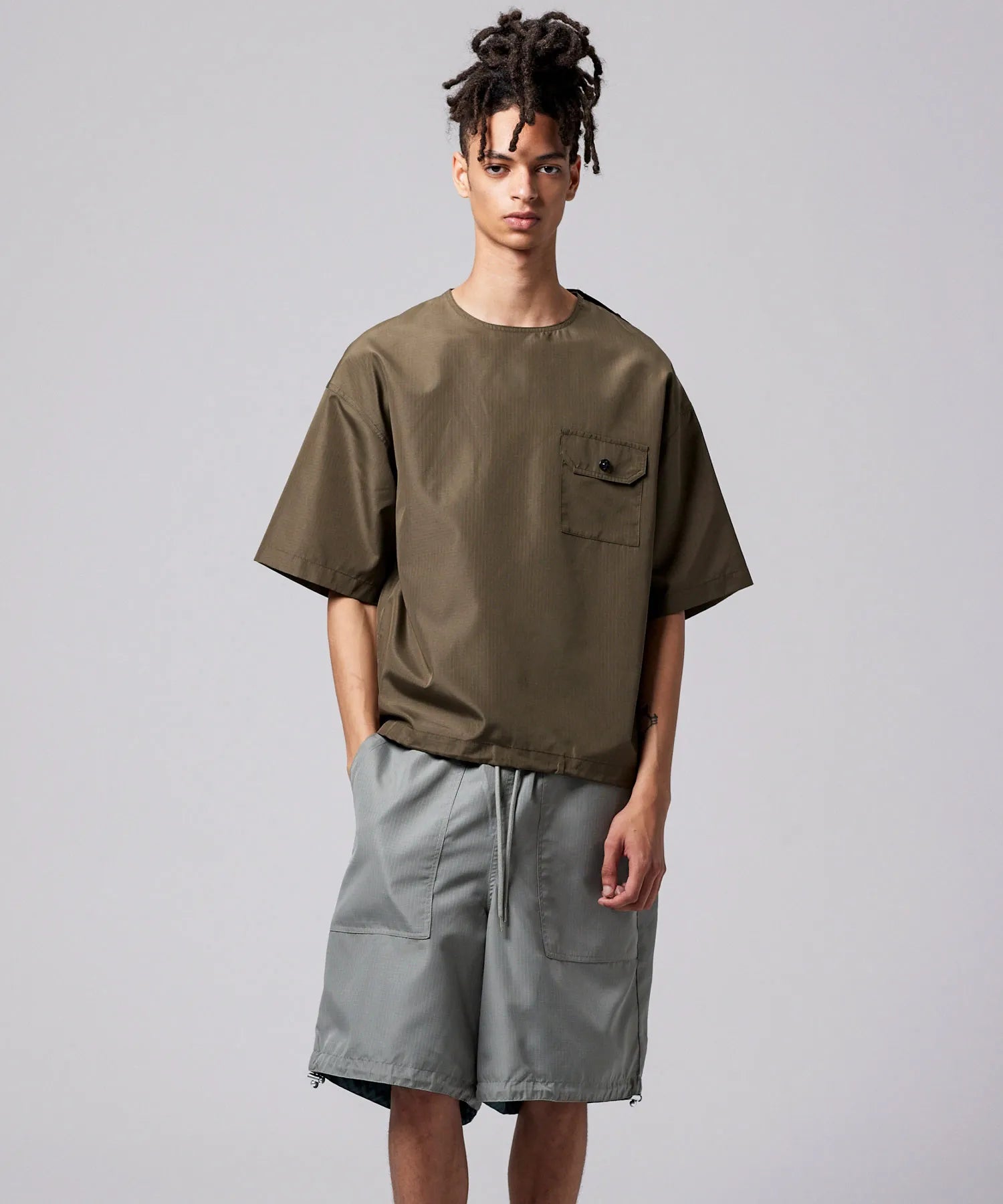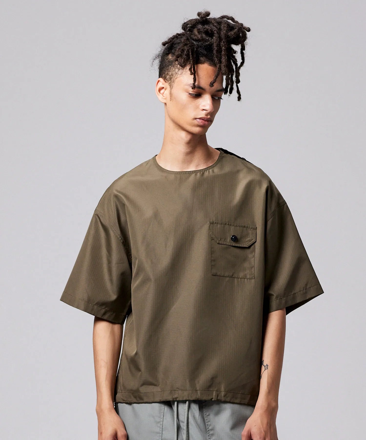 ダウンアイテムにも使用される軽量かつ高密度なミリタリーリップストップ生地を採用し、程よいハリ感とさらりとした着心地を両立しています。