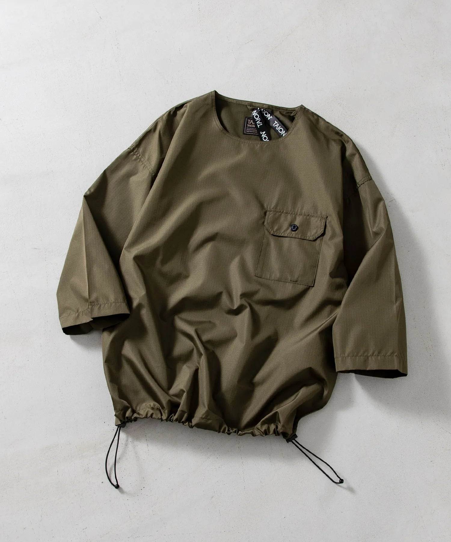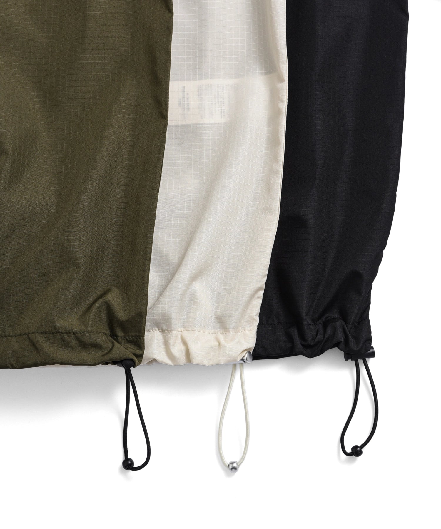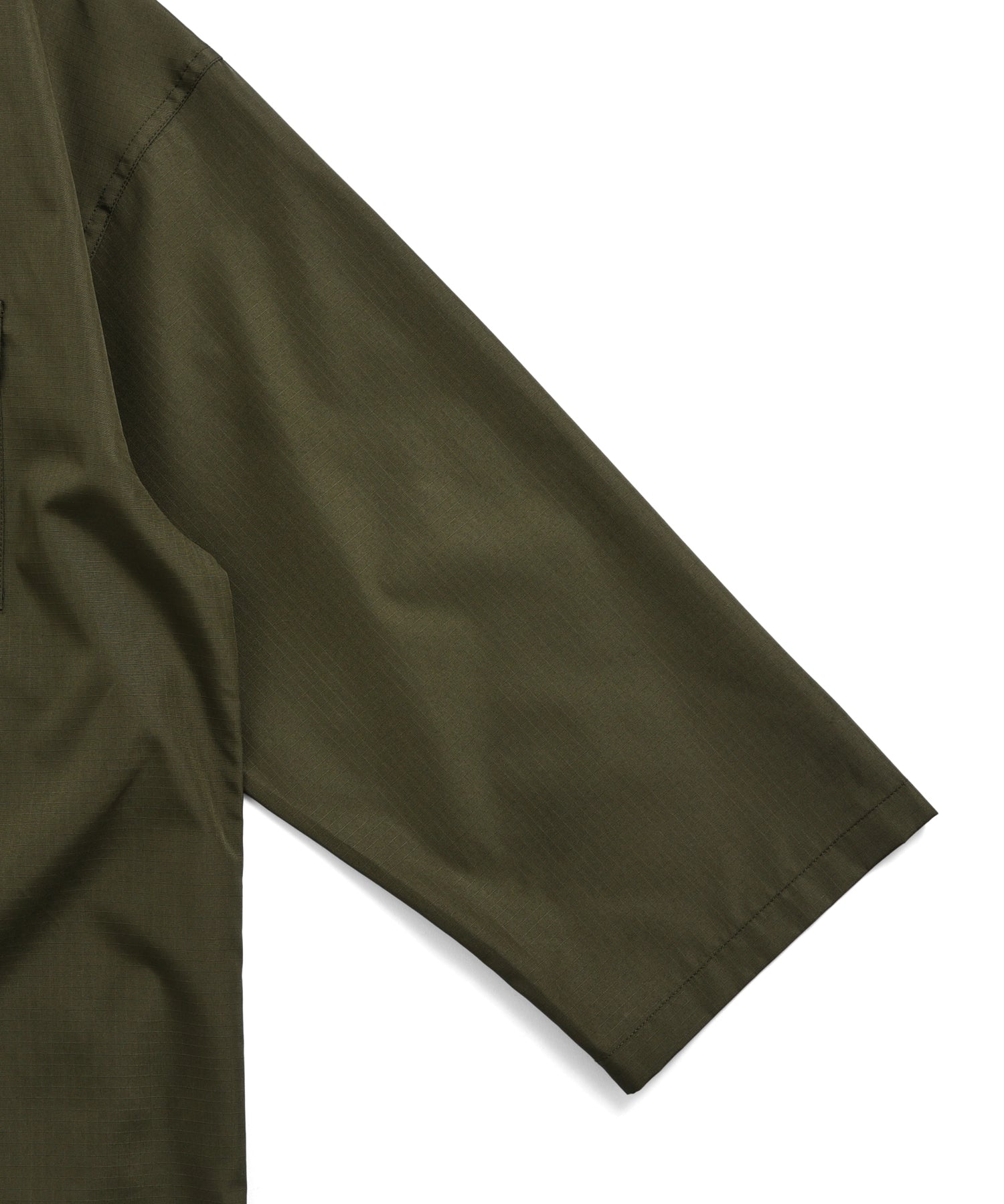 ダウンアイテムにも使用される軽量かつ高密度なミリタリーリップストップ生地を採用し、程よいハリ感とさらりとした着心地を両立しています。