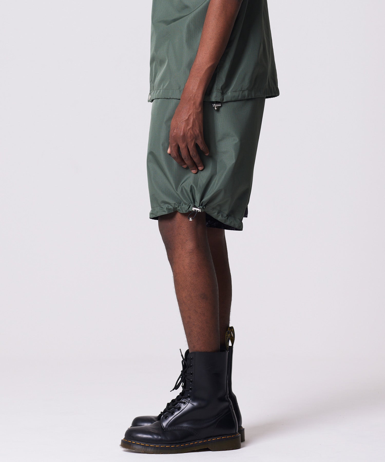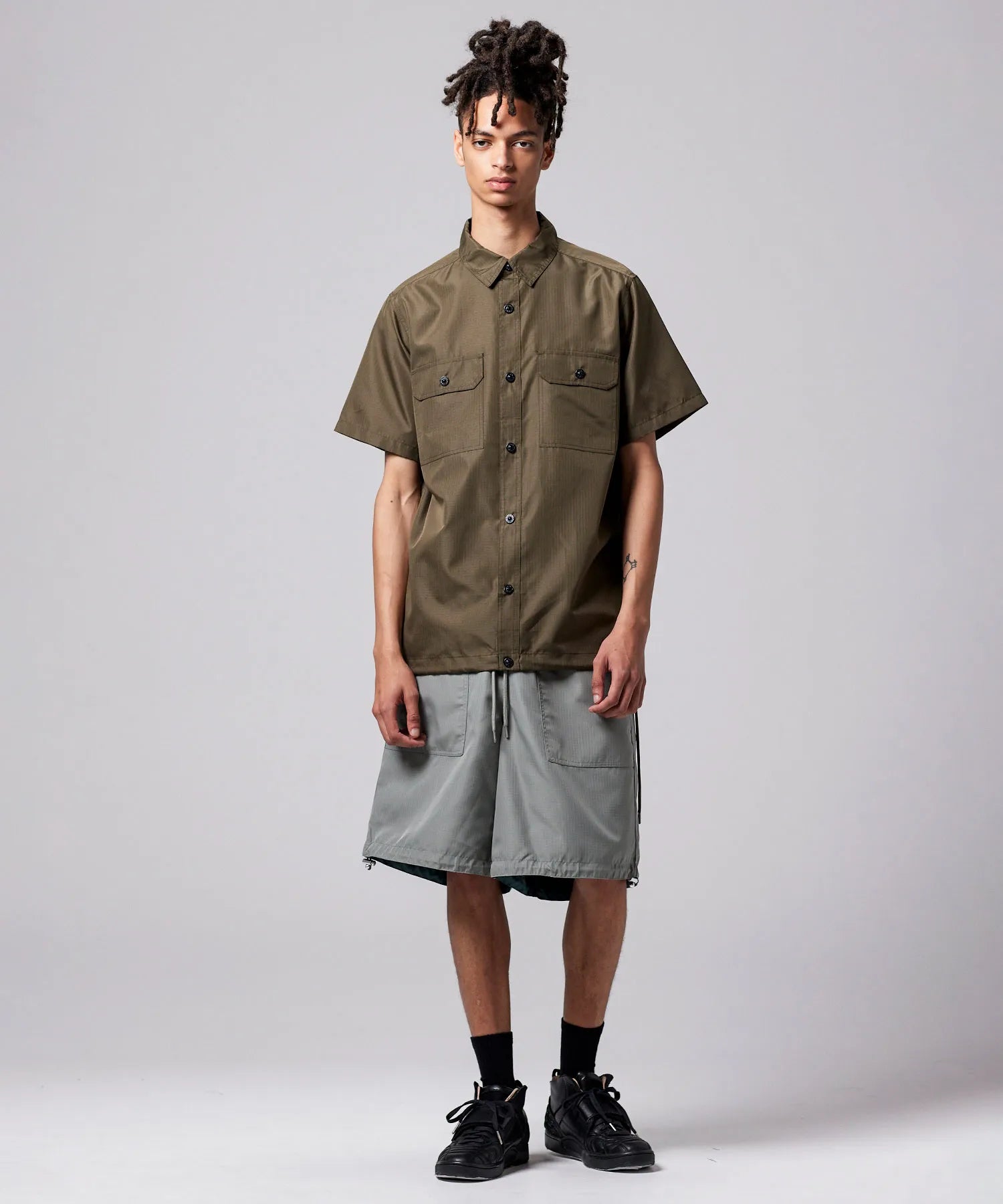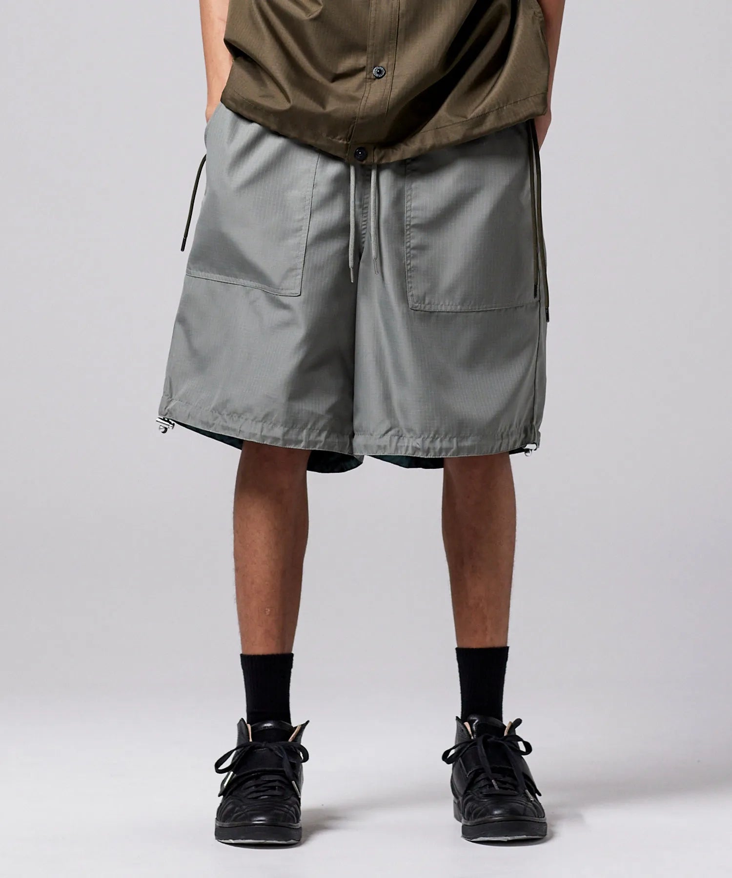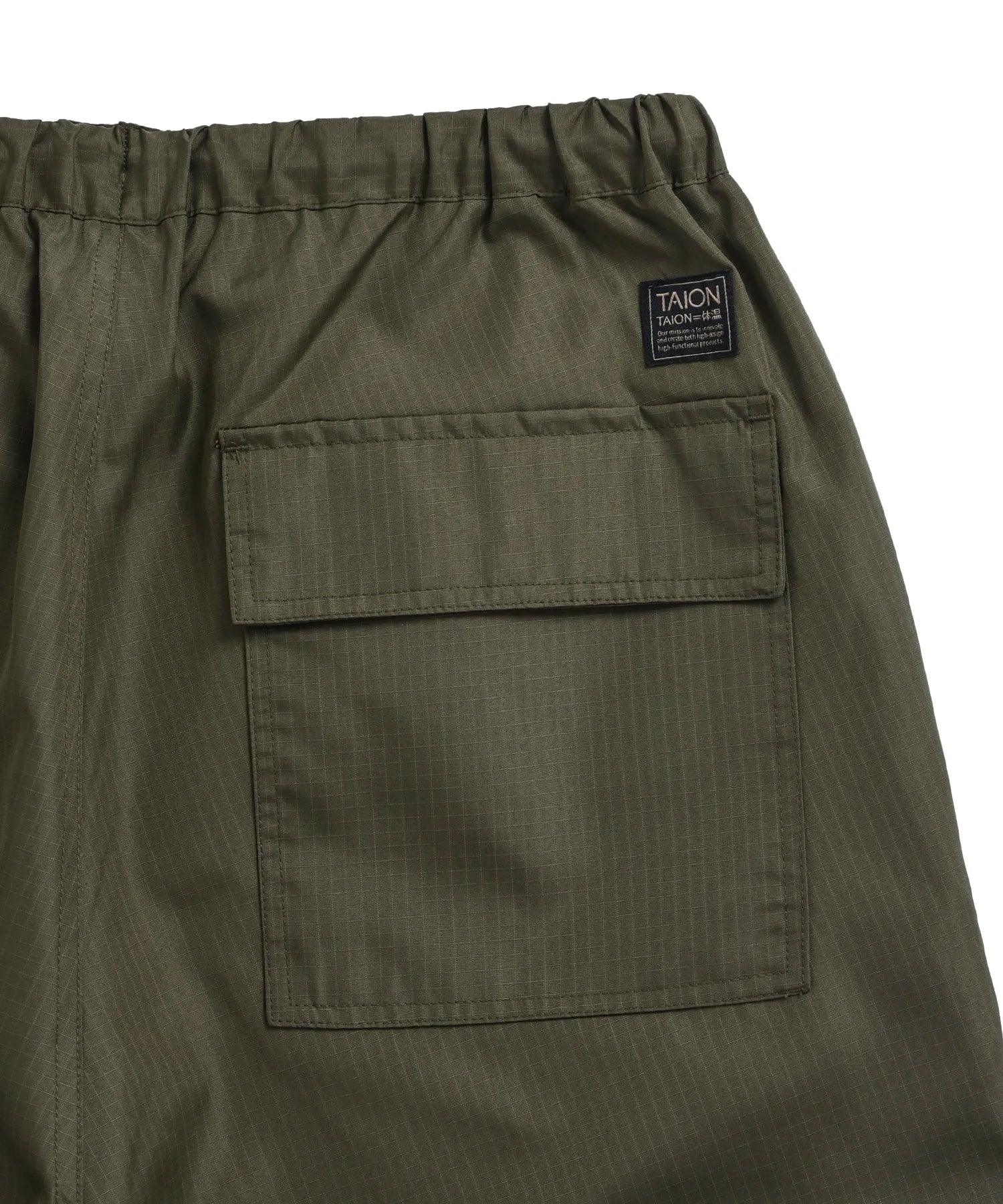 存在感のあるボリュームシルエットが印象的な、ミリタリーリバーシブルワイドショーツ。TAIONミリタリーラインで採用している高密度リップストップ生地を使用し、軽やかさと耐久性を兼ね備えた仕上がりです。