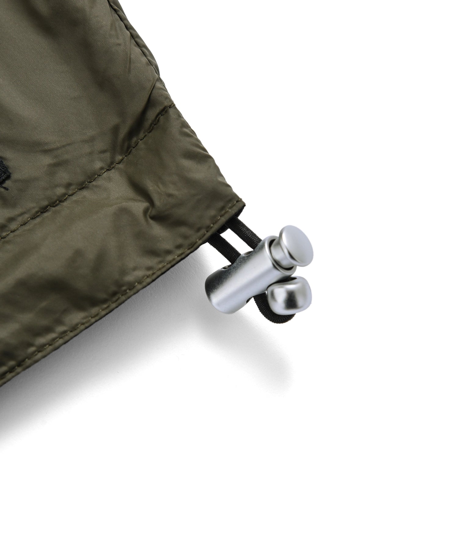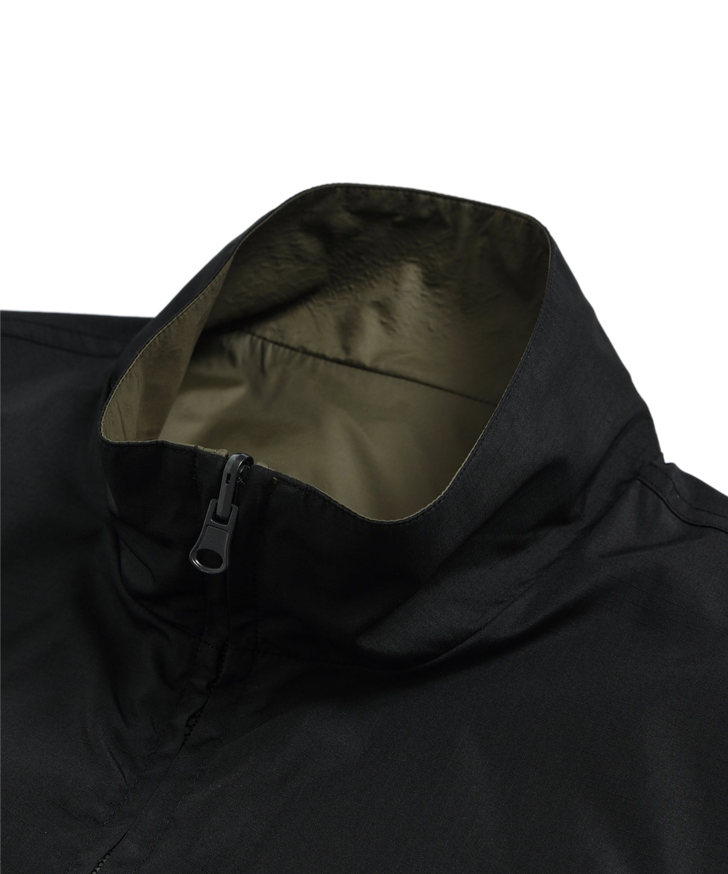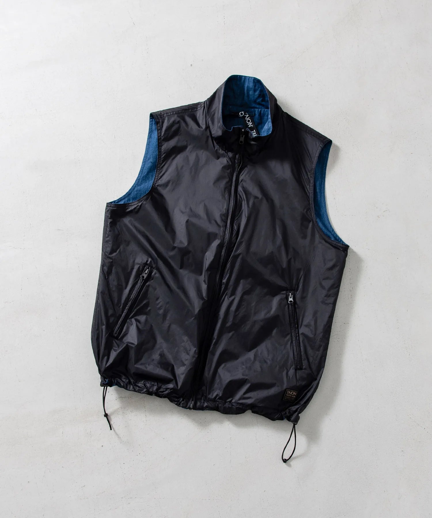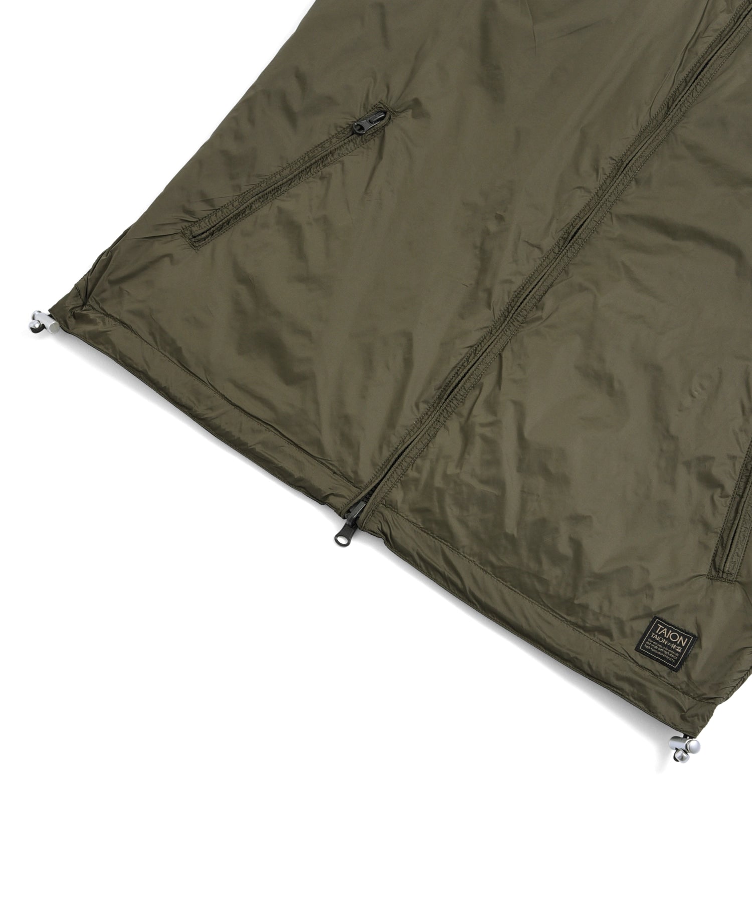 表面には滑らかなポリエステル生地を、裏面にはダウンアイテムにも使用される軽量かつ高密度なミリタリーリップストップ生地(一部デニム生地)を採用。