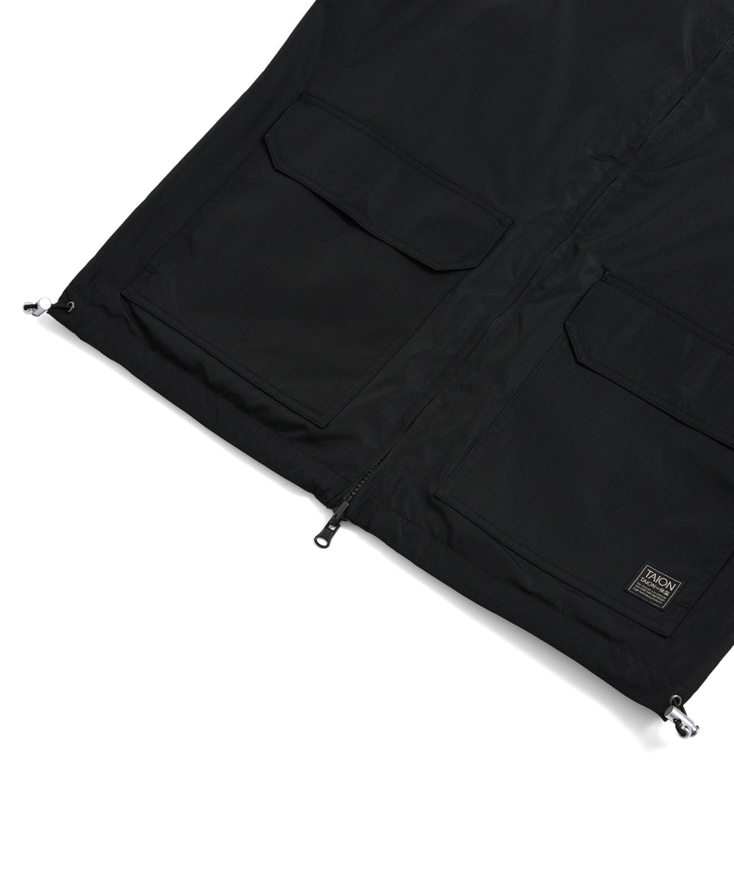 前たては開閉しやすいファスナー仕様、両脇にはファスナースリットを備え、可動域を確保しながらボトムのポケットにもアクセスしやすい設計に。