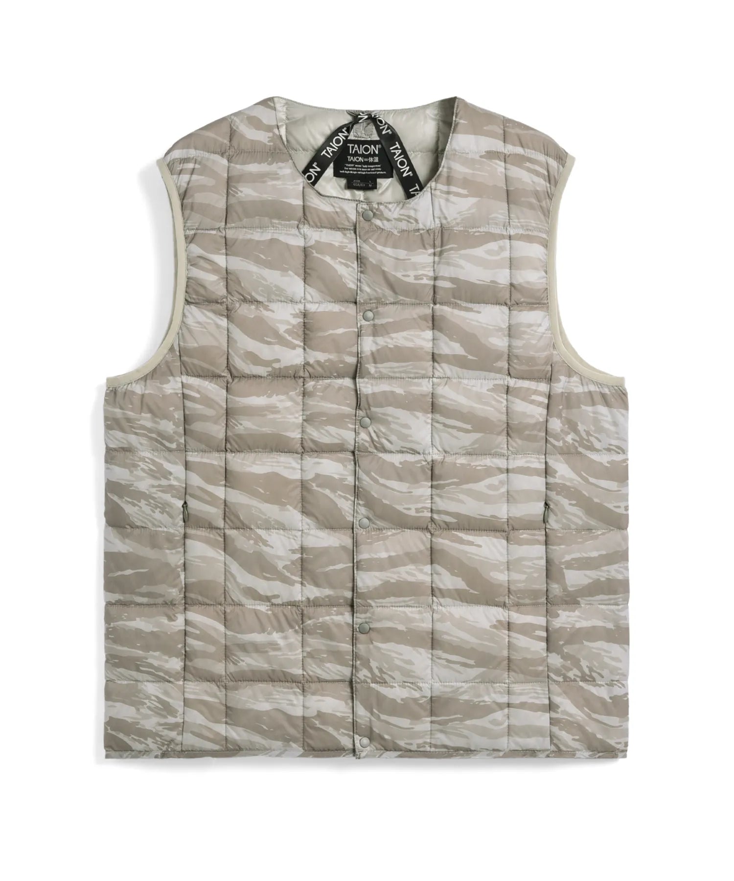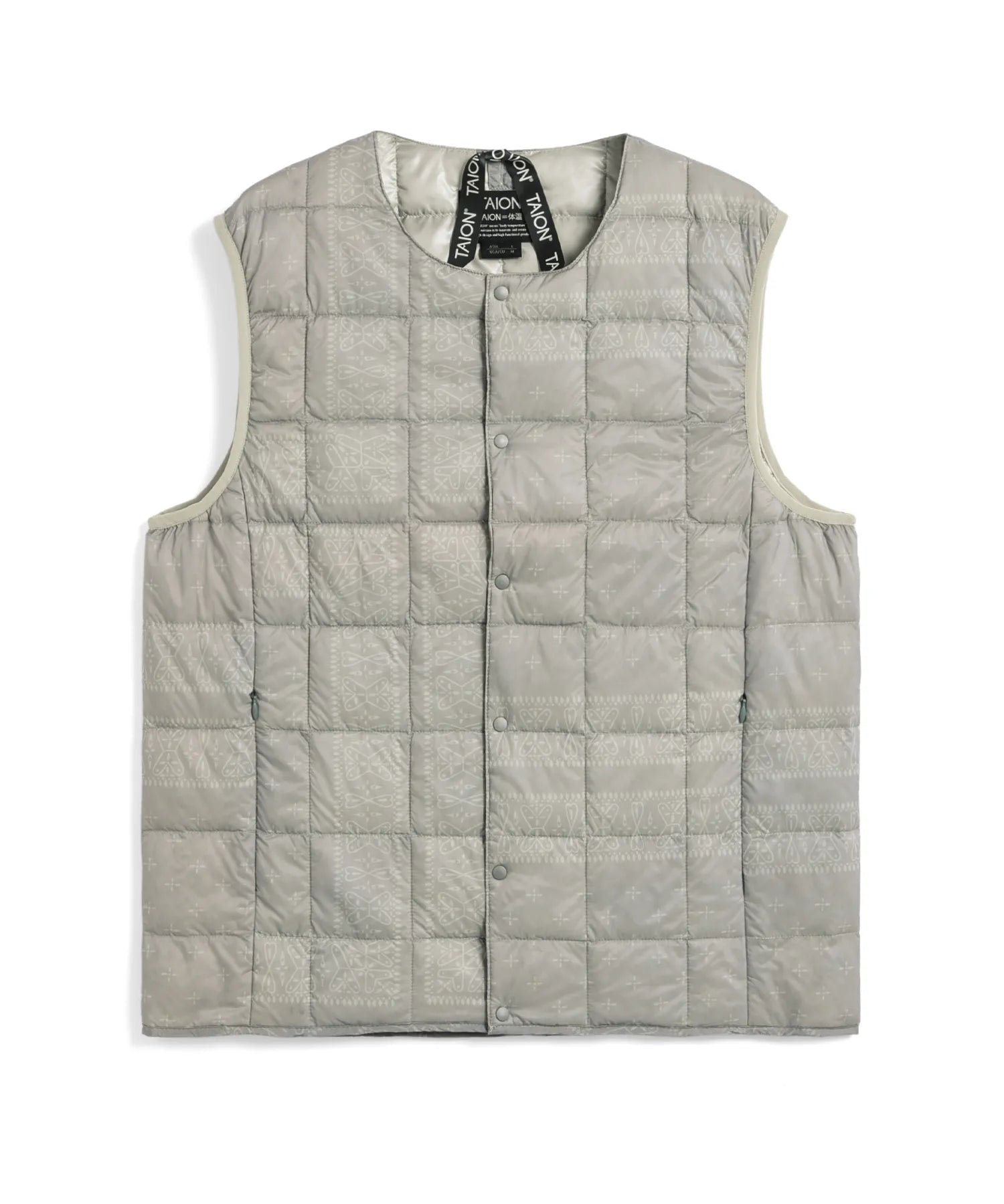 TAIONの定番、ベーシックインナーダウンは、ジャケットやコートの下に着るのはもちろん、Tシャツ・シャツ・パーカーなどの上にも気軽に羽織れる、軽くて暖かく着回しやすいシンプルなデザインが特徴です。