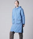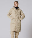 4つ穴ボタン開閉でクラシックな雰囲気、ミリタリーラインのフード付ロングダウンコート。