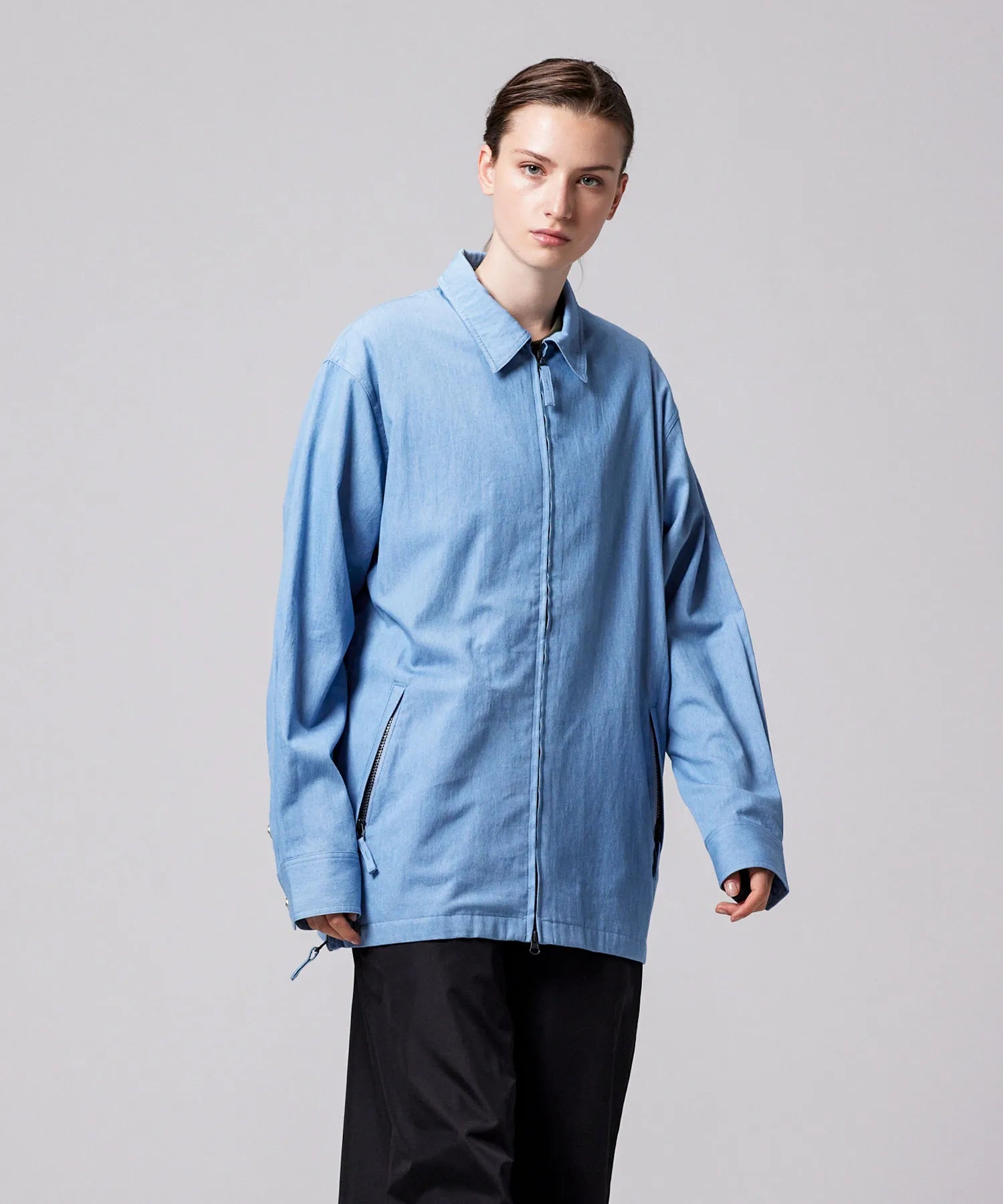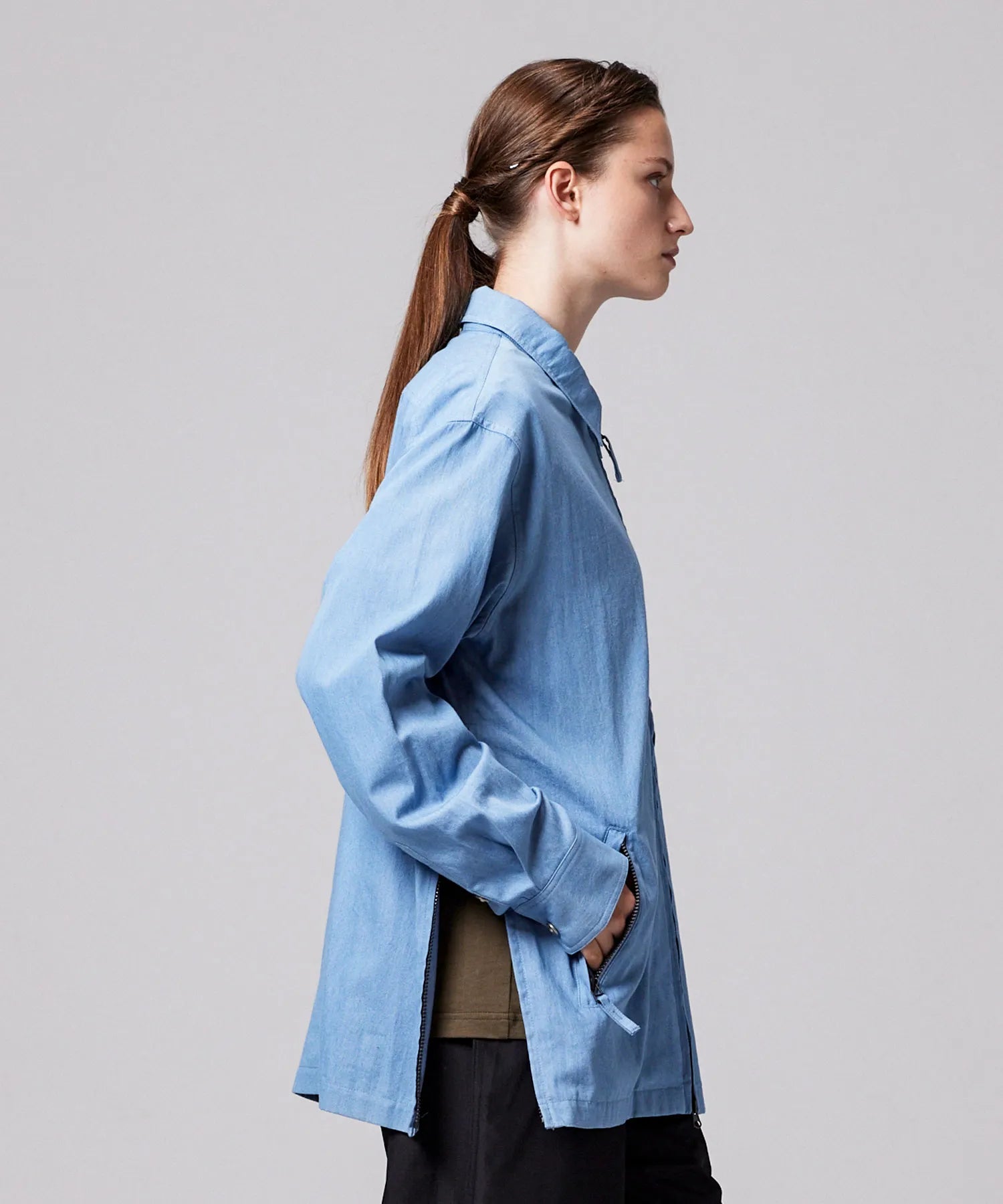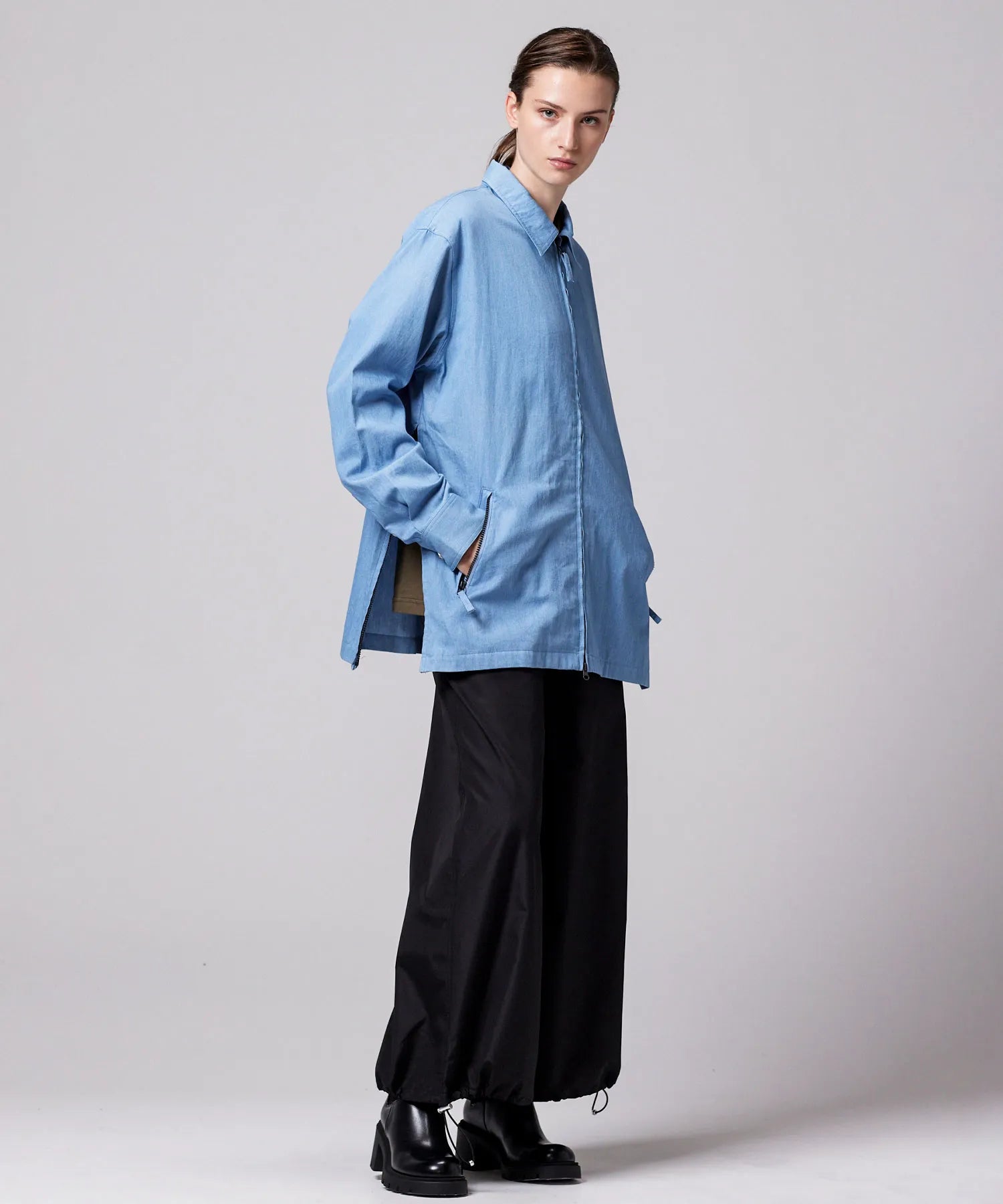 左右裾のスリットは、レイヤードスタイルに動きを加え、抜け感や軽快さを演出。