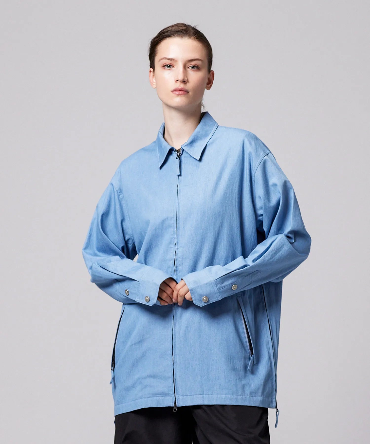 フロントファスナーと、左右ファスナーポケットがアクセントとなった、ミリタリーシャツ。