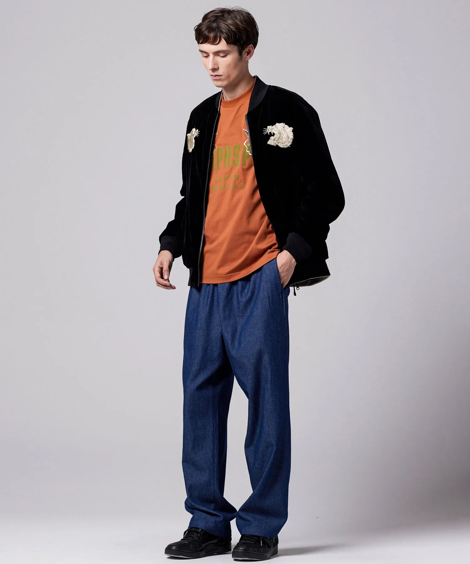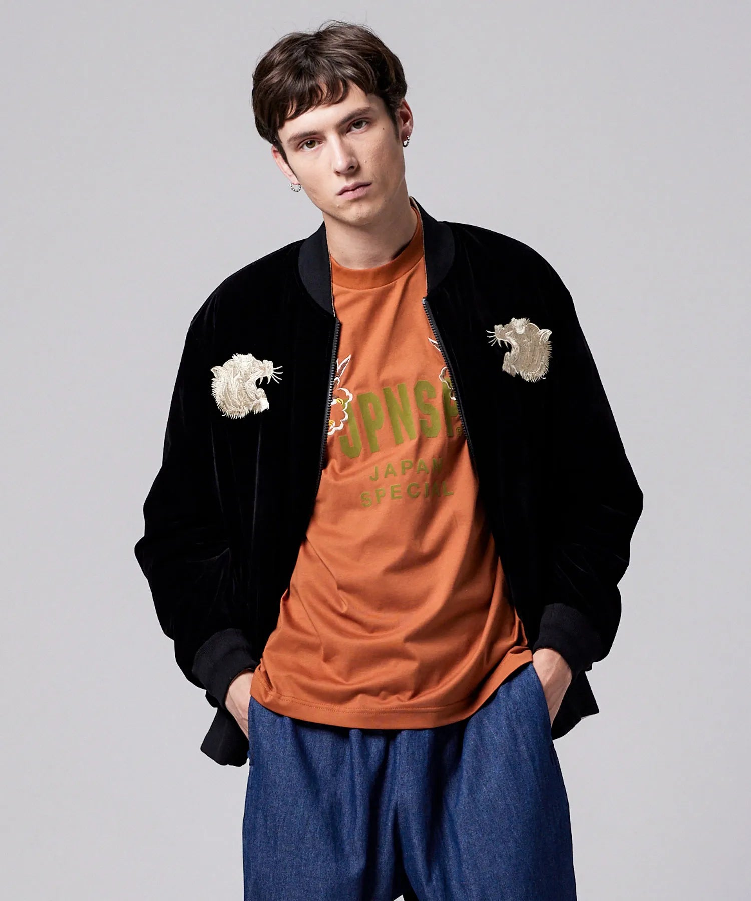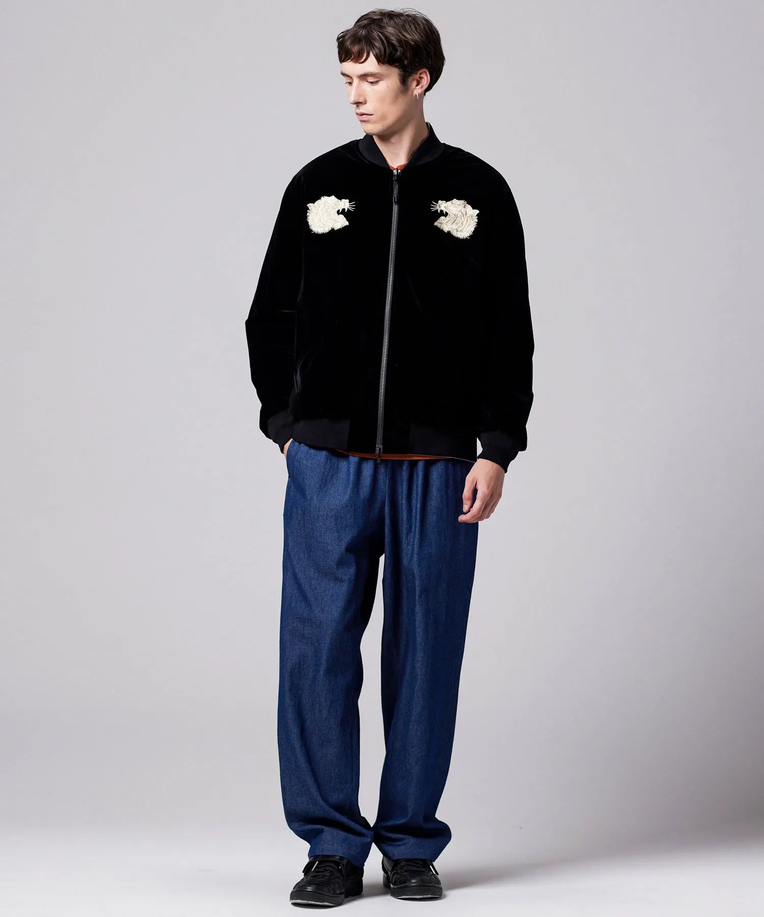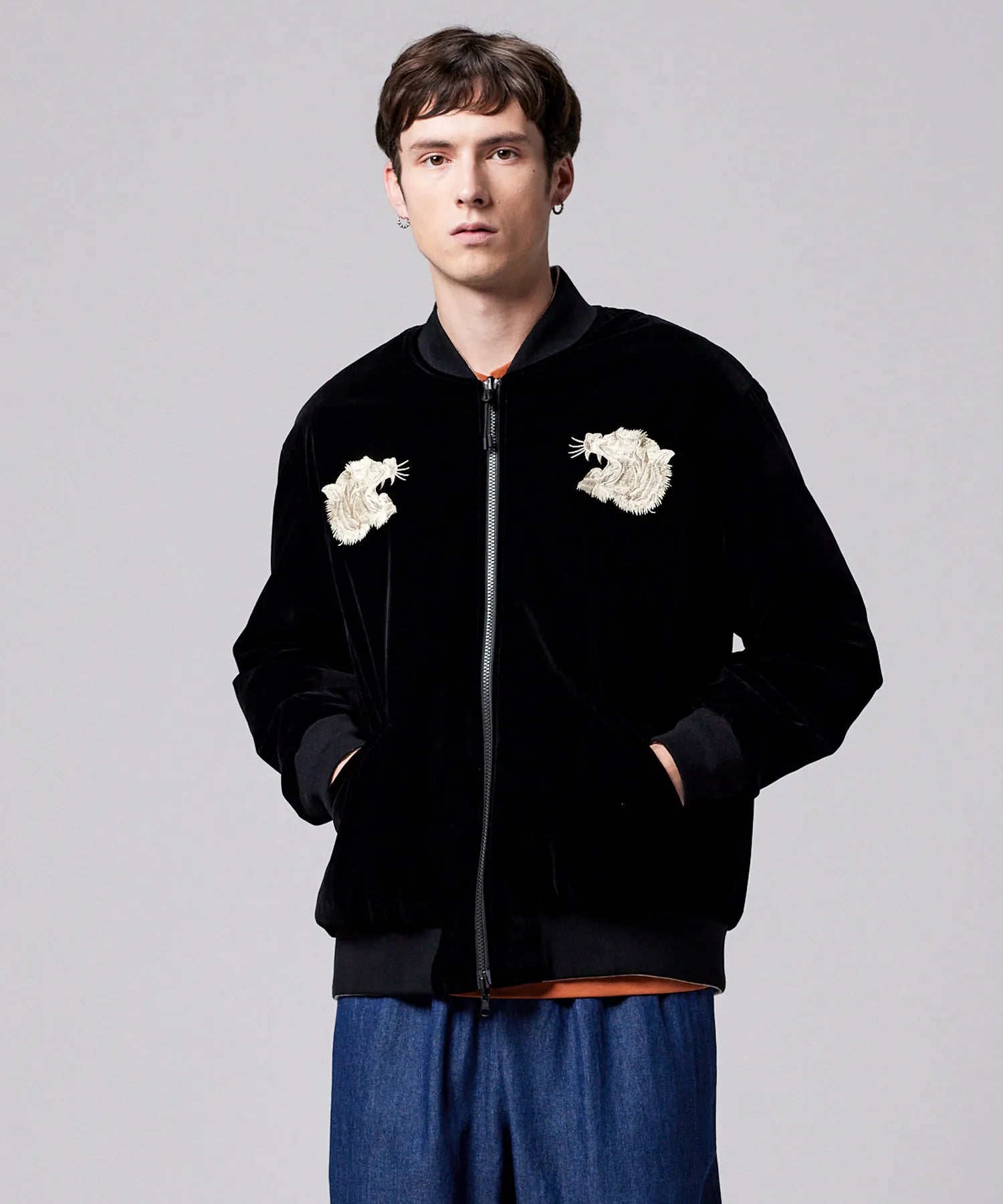 ・表地には、ベロア生地に前後スカジャン風の刺繍を入れています。