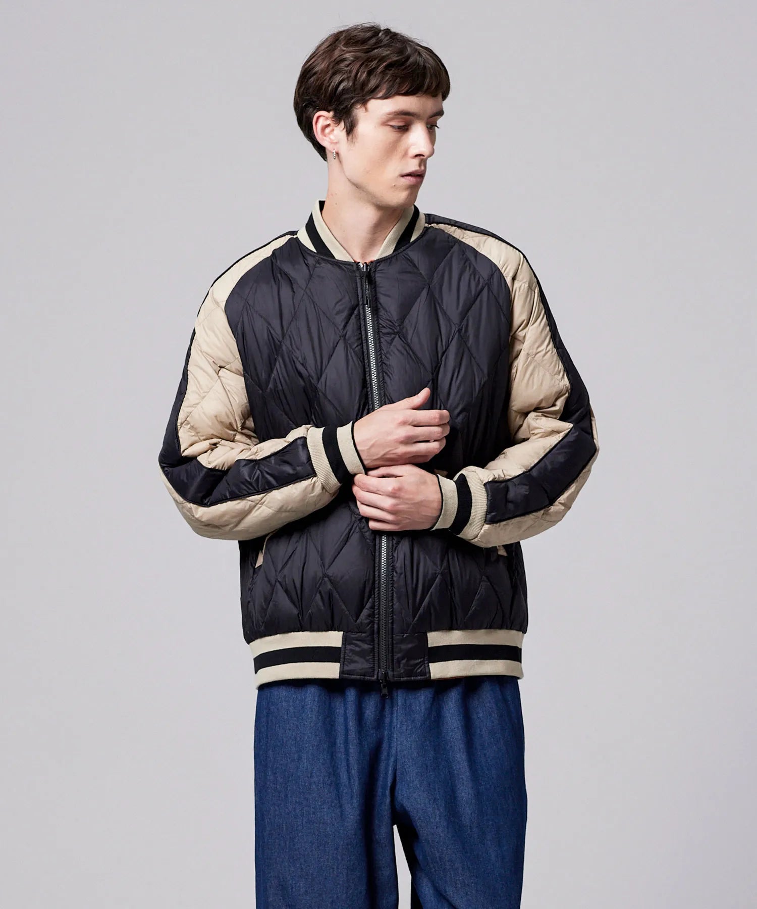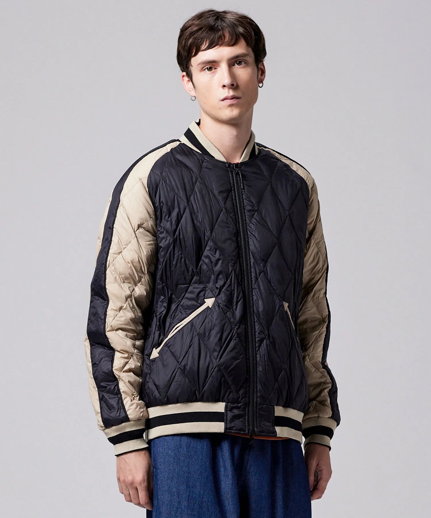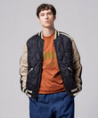スカジャンとダウンを組み合わせた、スカジャン風リバーシブルダウンジャケット。